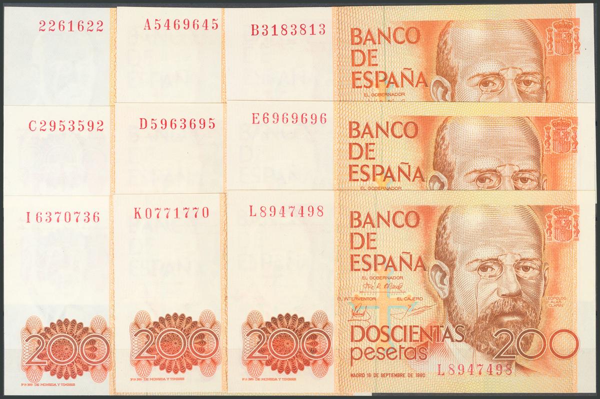 Precioso conjunto de 9 billetes de 200 Pesetas emitidos el 16 de Septiembre de 1980, incluyendo todas las series conocidas y el sin serie (A, B, C, D, E, I, K y L). (Edifil 2017: 480, 480a). Todos los billetes presentan su apresto original y excelente buena conservación. SC.