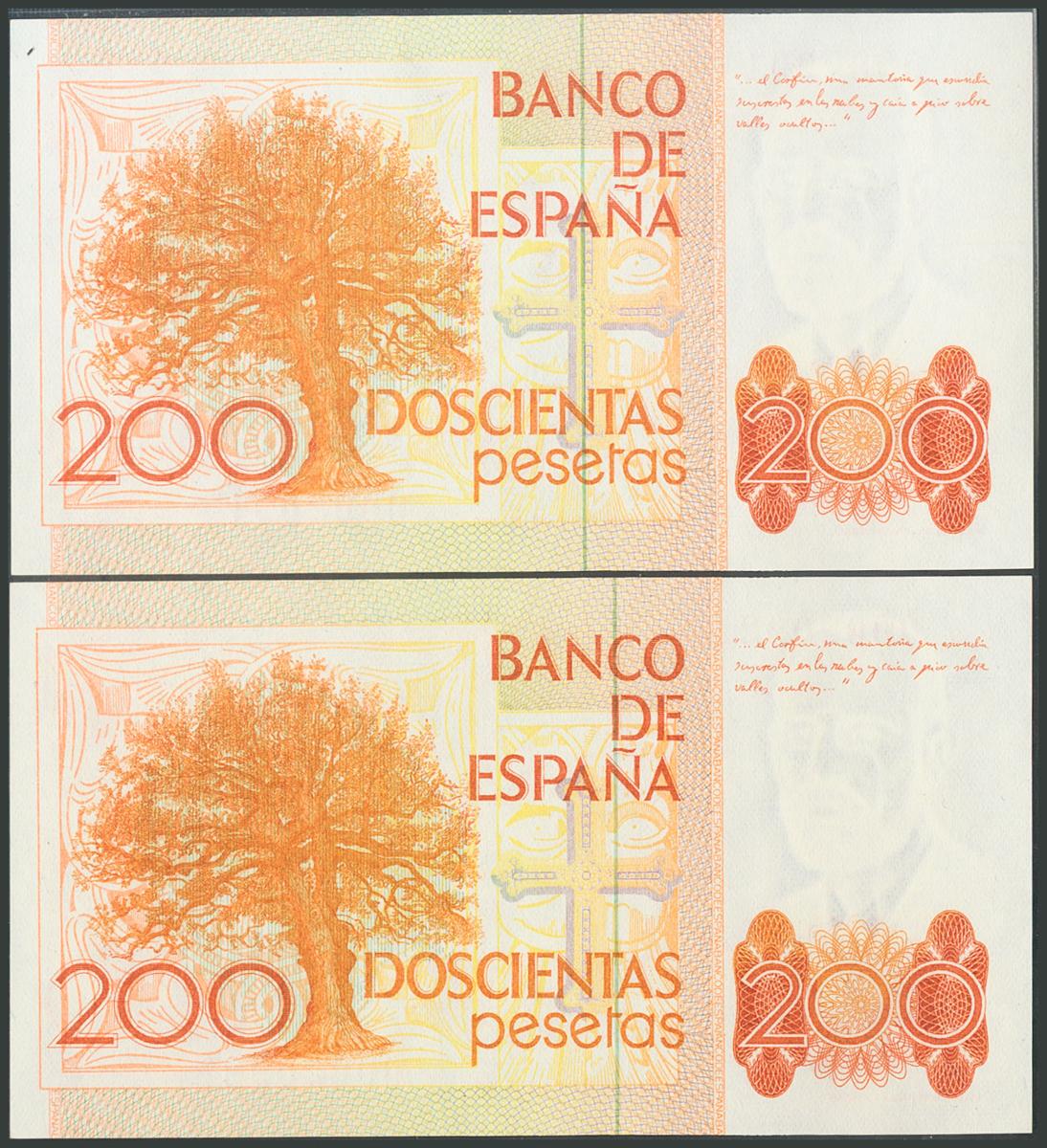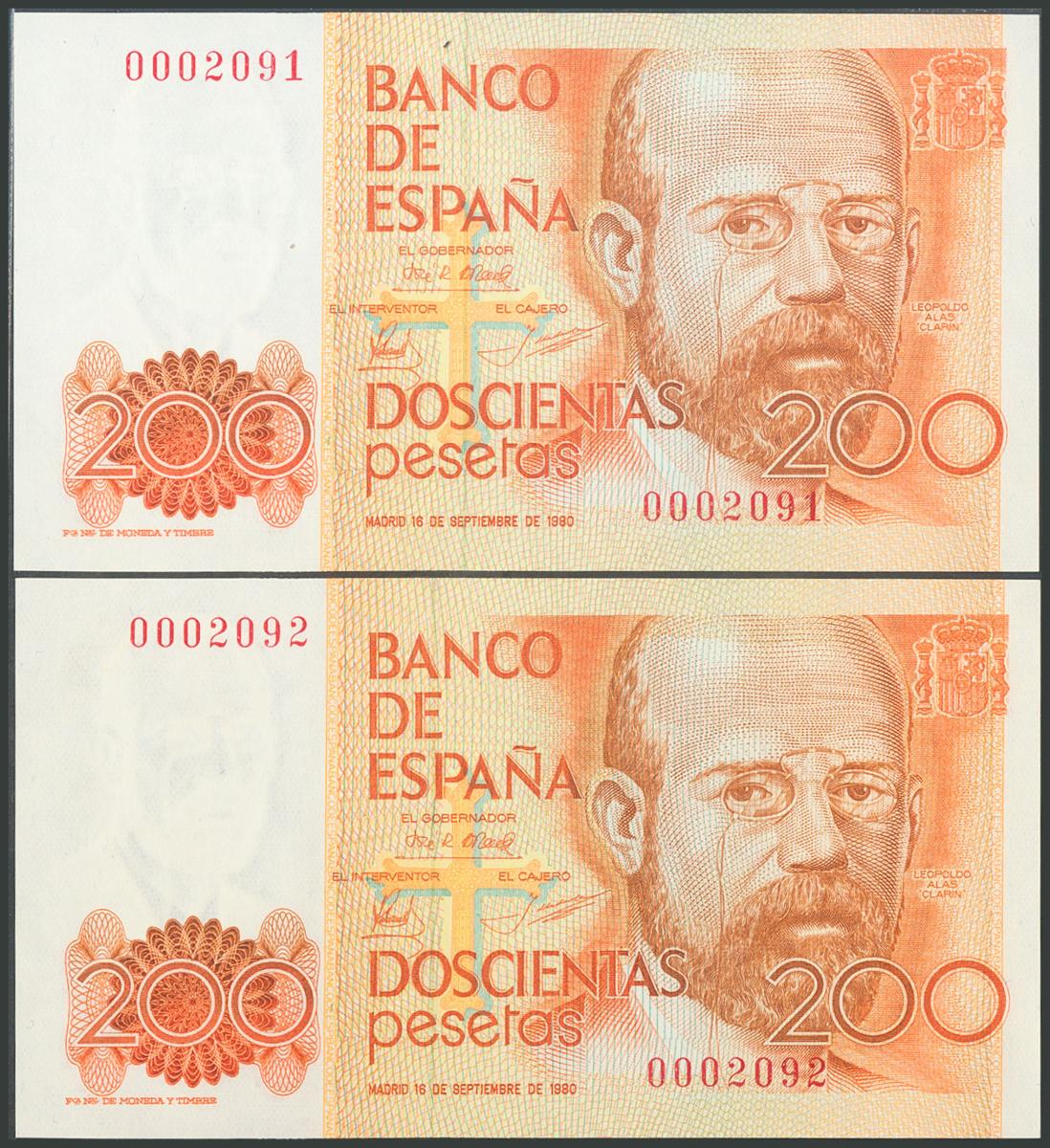 200 Pesetas. 16 de Septiembre de 1980. Pareja correlativa. Sin serie y numeración bajísima. (Edifil 2017: 480). SC.