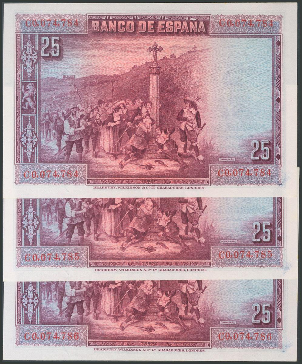 25 Pesetas. 15 de Agosto de 1925. Trío correlativo. Serie C. (Edifil 2017: 353). Apresto original. SC.