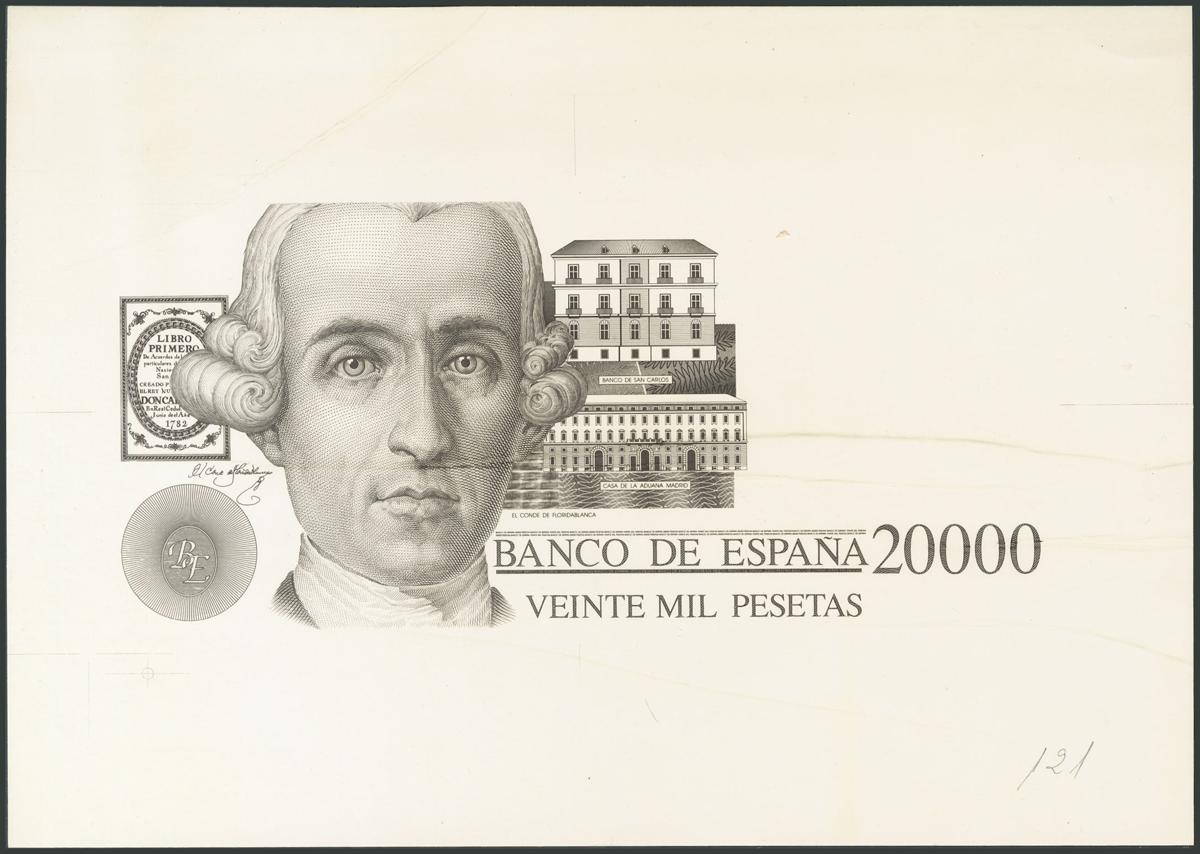 Prueba definitiva en color negro del reverso de un billete no emitido de 20000 Pesetas "el Conde de Floridablanca", conocemos la propuesta de fecha de emisión del 2 de Febrero de 1990 aunque no aparece impresa, y con numeración al dorso en color verde-oscuro Q0002209, proyecto realizado por José López López-Pavía. (la tipografía del numerador es la típica de los proyectos de la FNMT de los años 80 y 90). (Edifil 2017: NE712Pa). Pieza de enorme espectacularidad y rareza (natural fuelle de papel sin importancia, descrito sólo a título informativo).