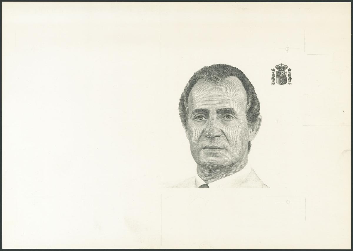 Prueba del busto en color negro del anverso de un billete no emitido de 20000 Pesetas "el Conde de Floridablanca", conocemos la propuesta de fecha de emisión del 2 de Febrero de 1990 aunque no aparece impresa en la prueba, y con numeración al dorso en color verde-oscuro Q0001267, proyecto realizado por Pablo Sampedro. (la tipografía del numerador es la típica de los proyectos de la FNMT de los años 80 y 90). (Edifil 2017: NE712P, variante "sólo busto"). Rara.