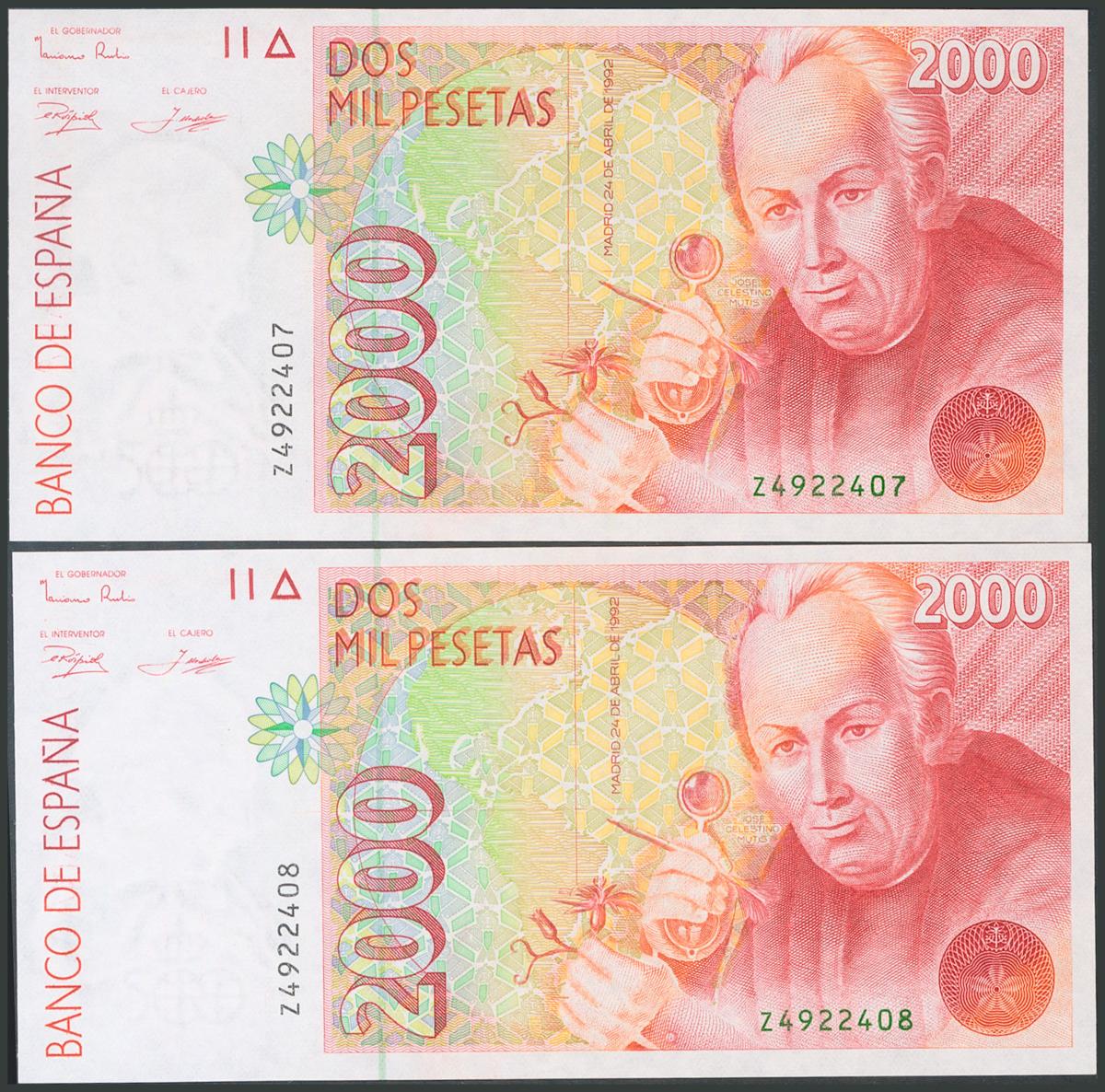 2000 Pesetas. 24 de Abril de 1992. Pareja correlativa. Serie Z. (Edifil 2017: 482a). SC.