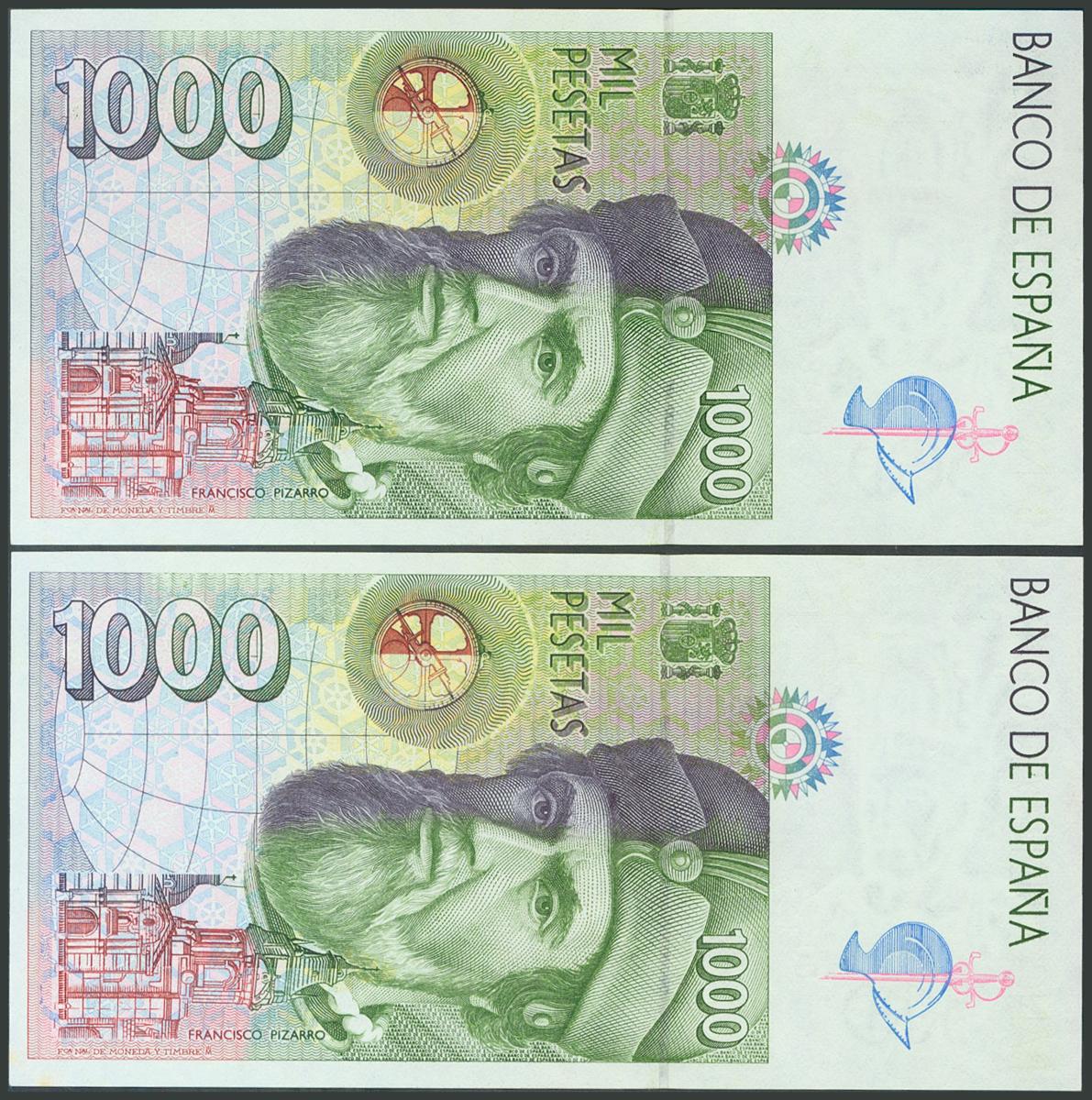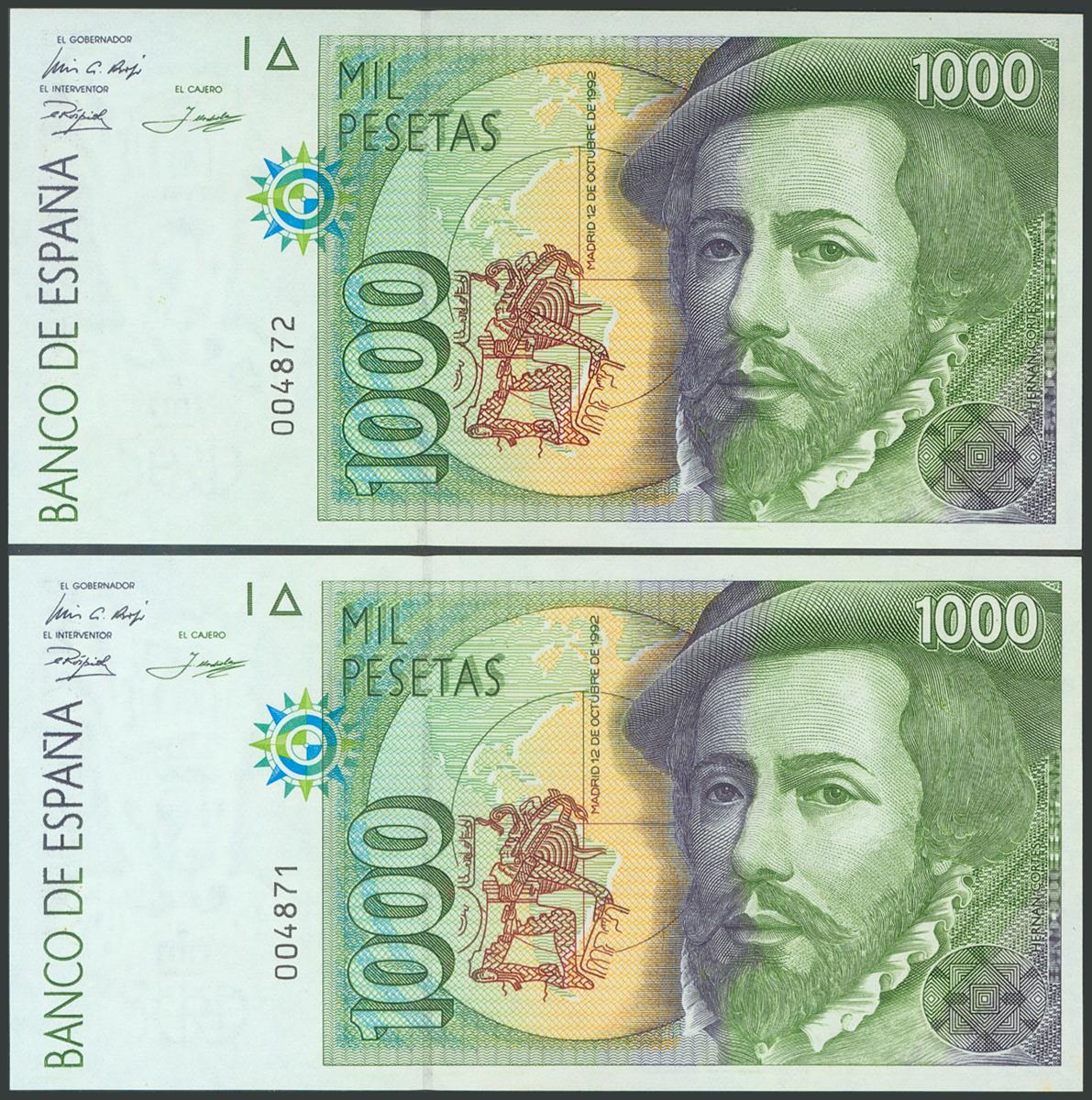 1000 Pesetas. 12 de Octubre de 1992. Pareja correlativa. Tipo I, sin serie y numeración baja. (Edifil 2017: 483). SC-.
