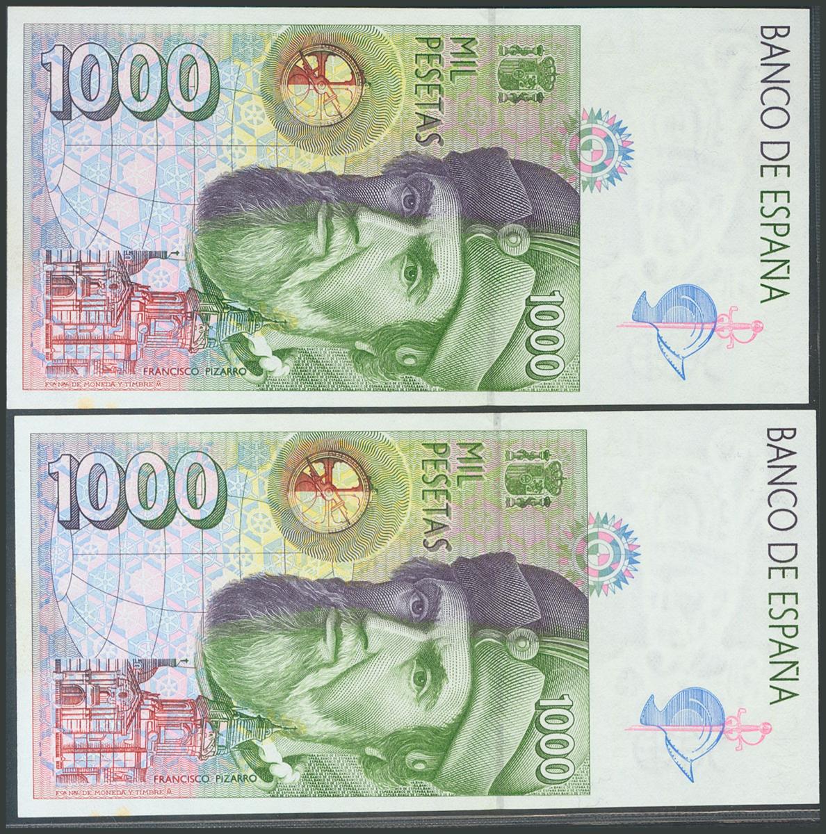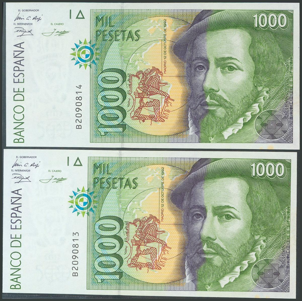 1000 Pesetas. 12 de Octubre de 1992. Pareja correlativa. Serie B. (Edifil 2017: 483a). SC.