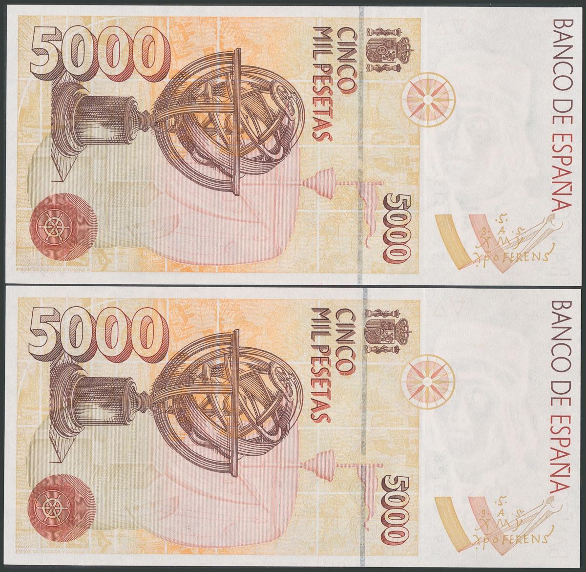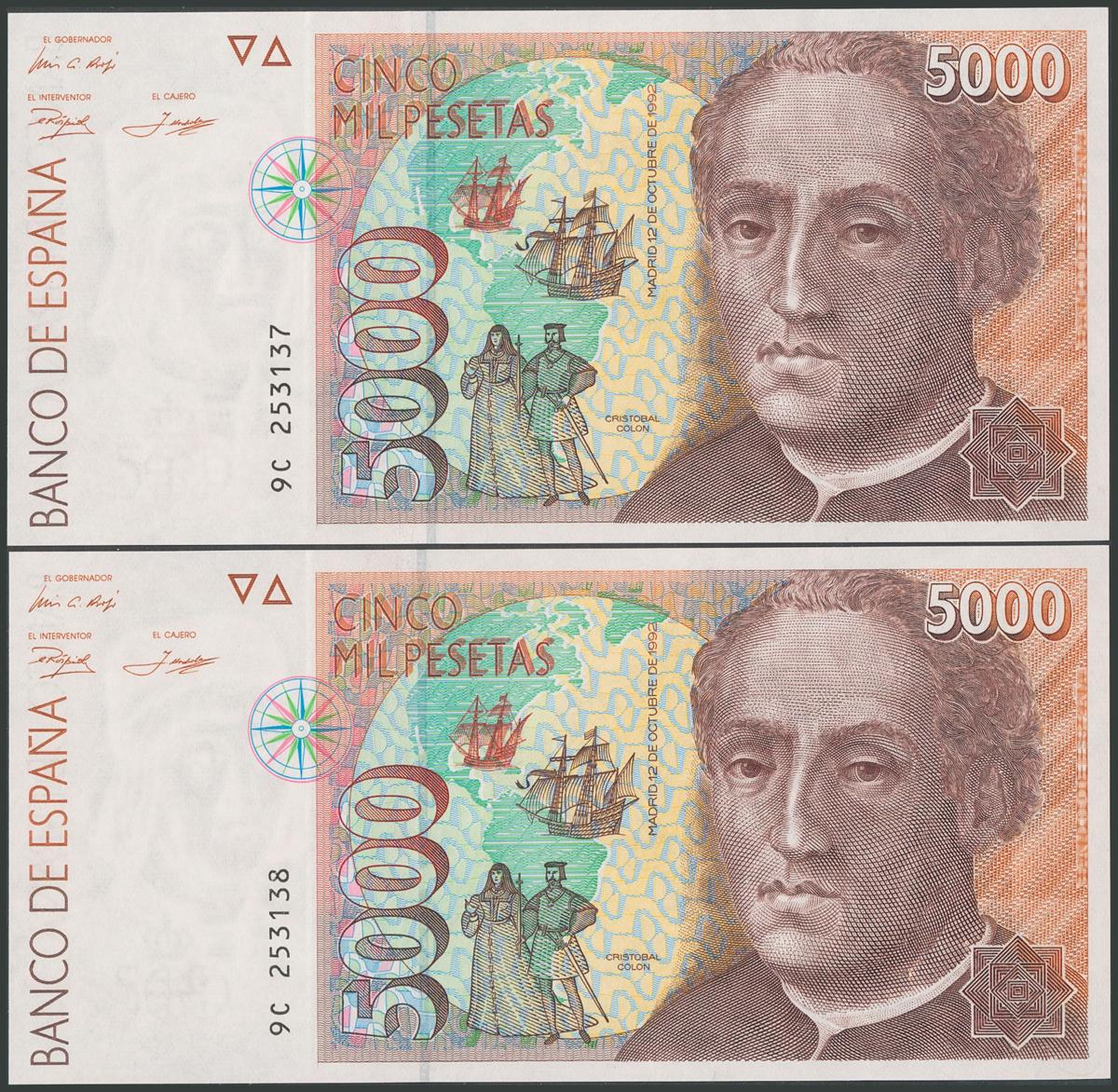 5000 Pesetas. 12 de Octubre de 1992. Pareja correlativa. Serie especial 9C. (Edifil 2017: 484b). SC.