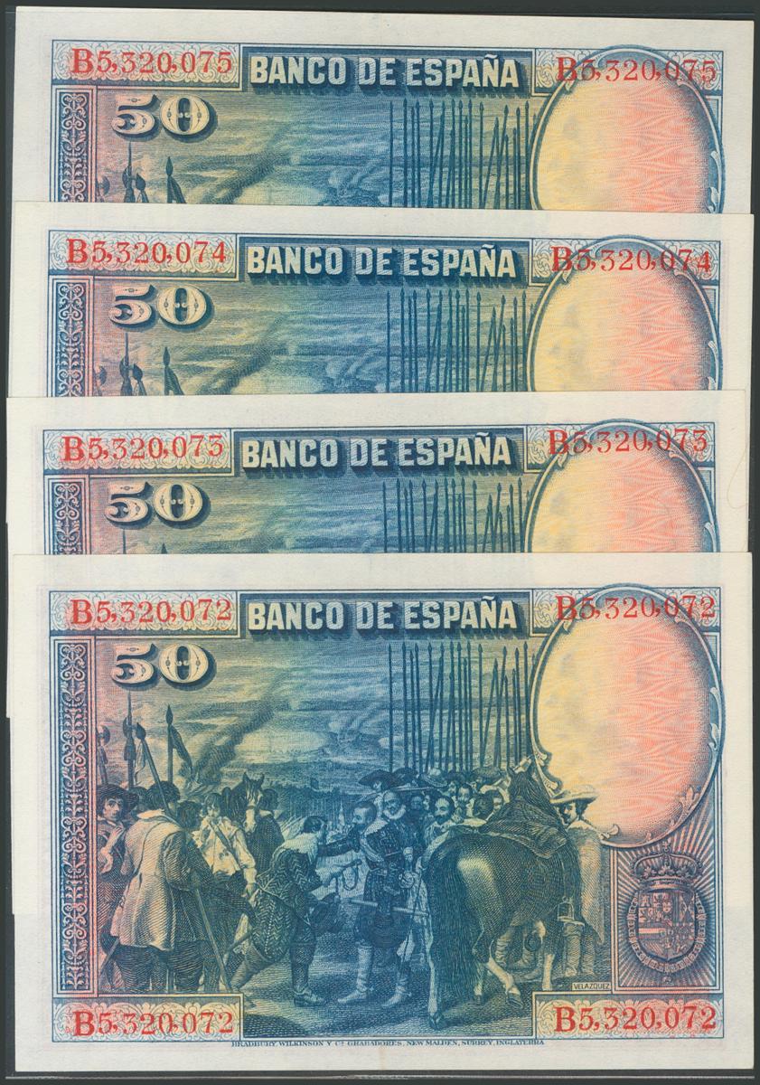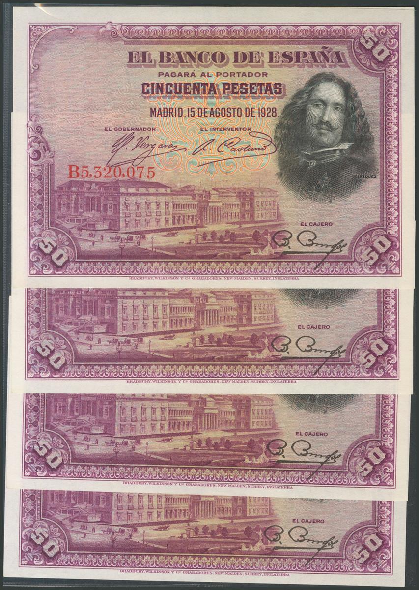 Conjunto de 4 billetes correlativos de 50 Pesetas emitidos el 15 de Agosto de 1928, todos con la serie B. (Edifil 2017: 354), conservando todo su apresto original. EBC+.