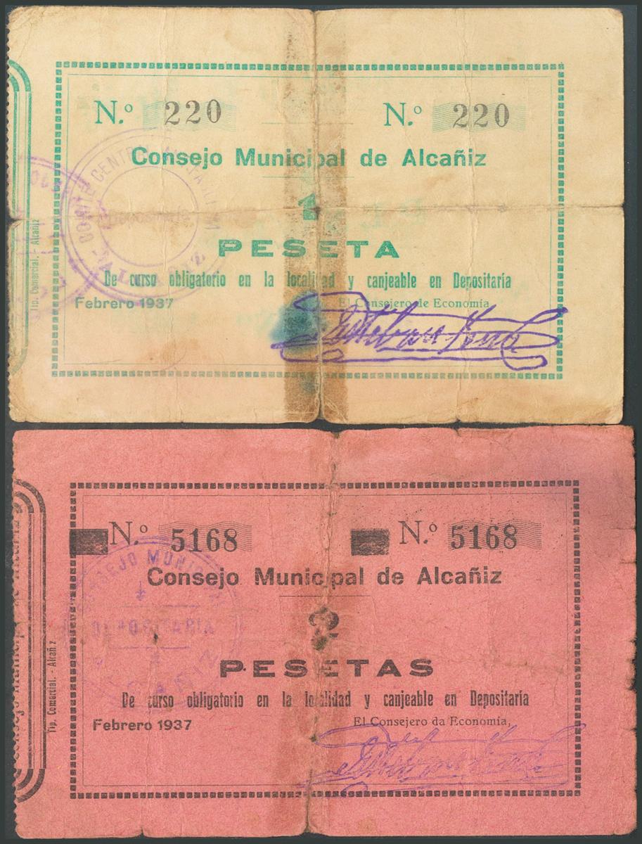 ALCAÑIZ (TERUEL). 1 Peseta y 2 Pesetas. Febrero 1937. (González: 295/96). Ambos con presencia de cinta adhesiva. BC.