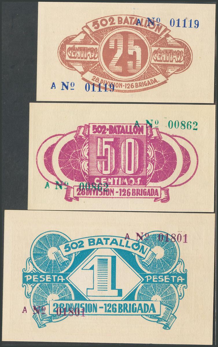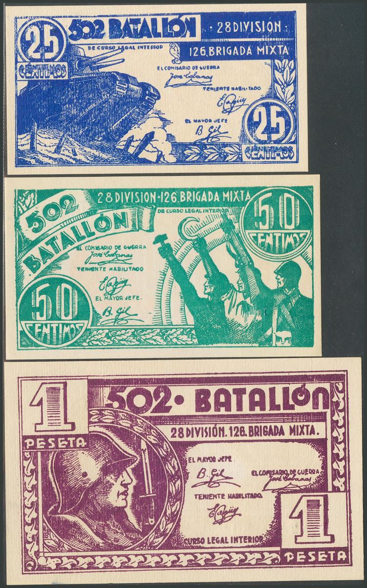 BILLETE MILITAR-502 BATALLON. Serie completa de la Brigada Mixta. 25 Céntimos, 50 Céntimos y 1 Peseta. (1937ca). Serie A. (González: 5876/78). Rara. SC.