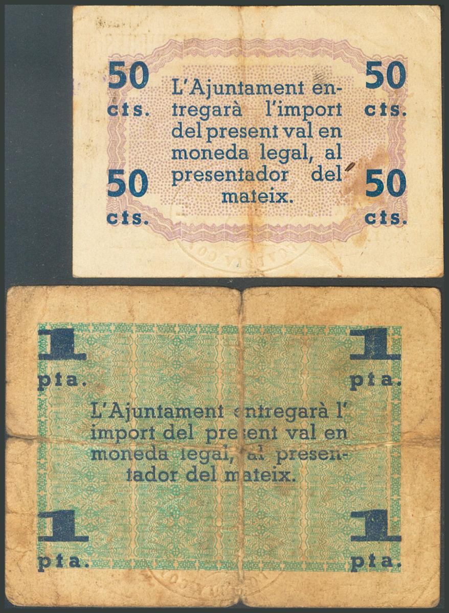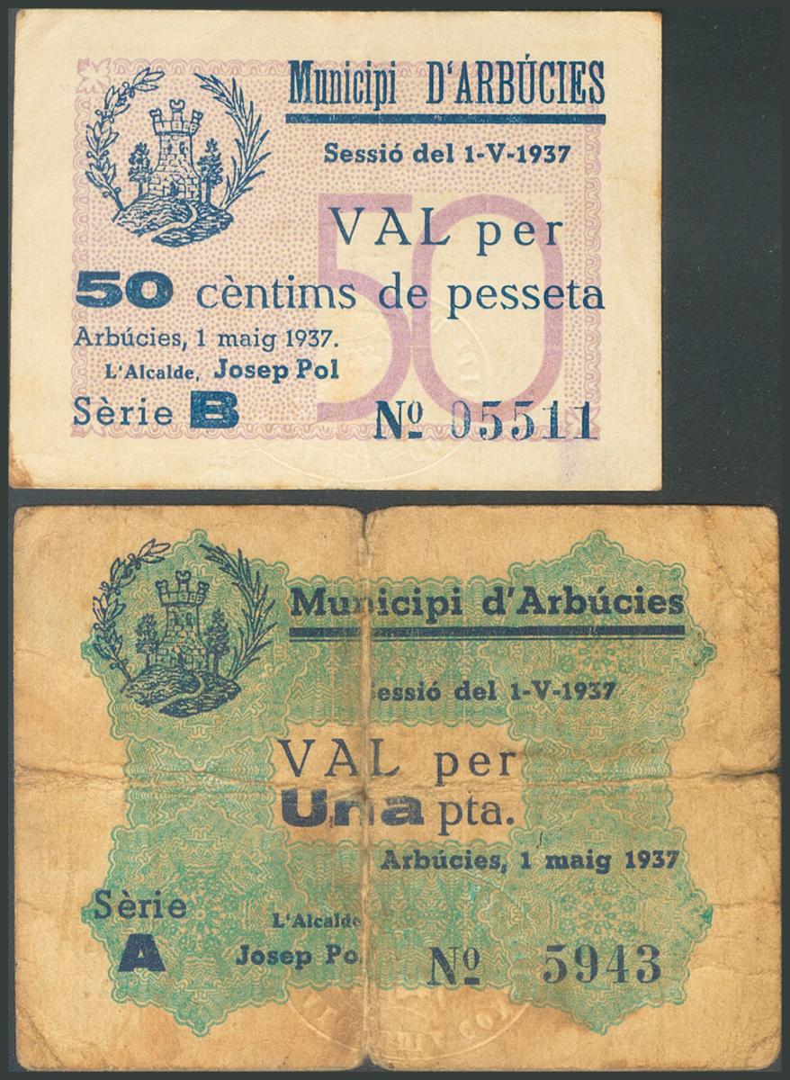 ARBUCIES (GERONA). 50 Céntimos y 1 Peseta. 1 de Mayo de 1937. Series B y A, respectivamente. (González: 6322/23). Rara serie completa. EBC-/BC.