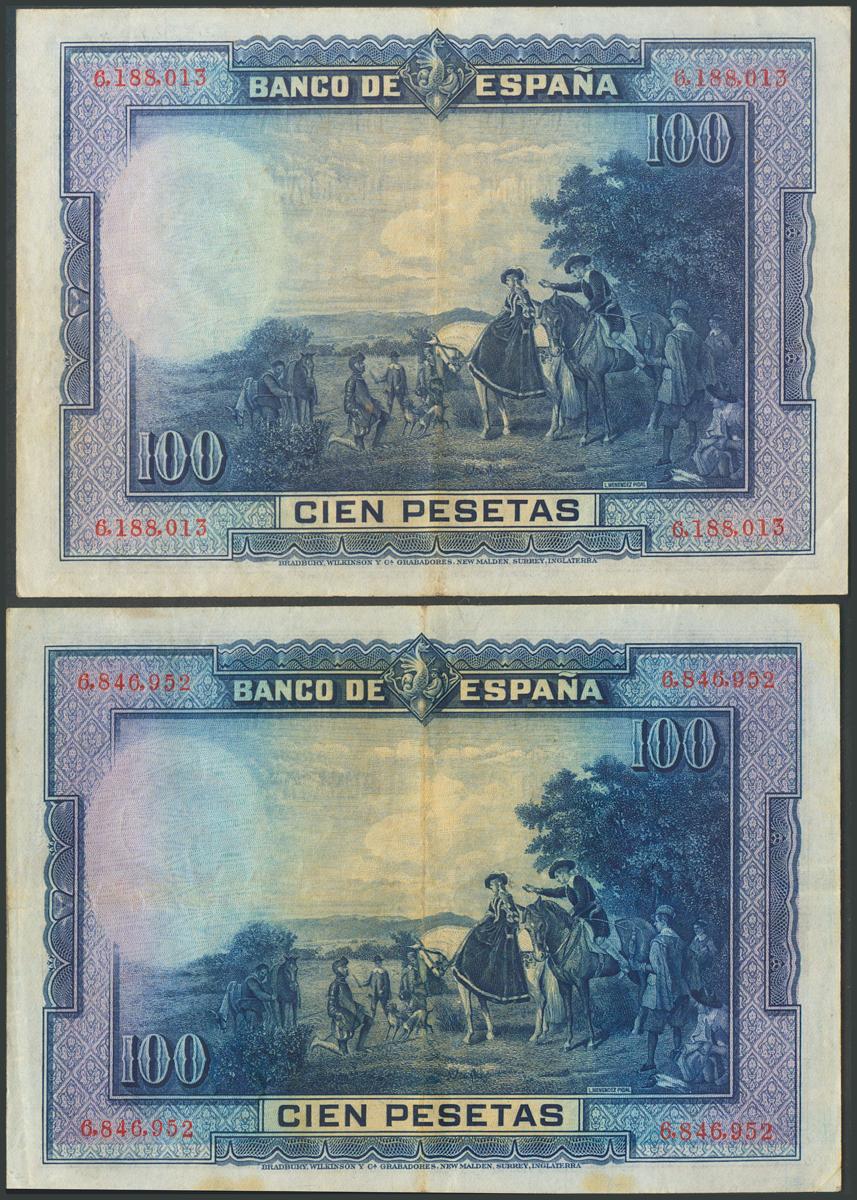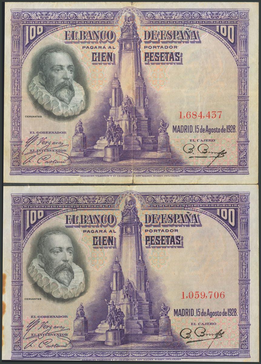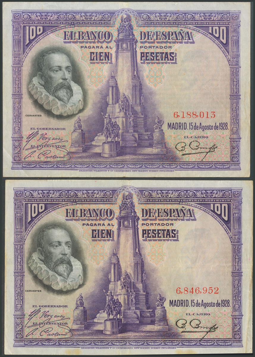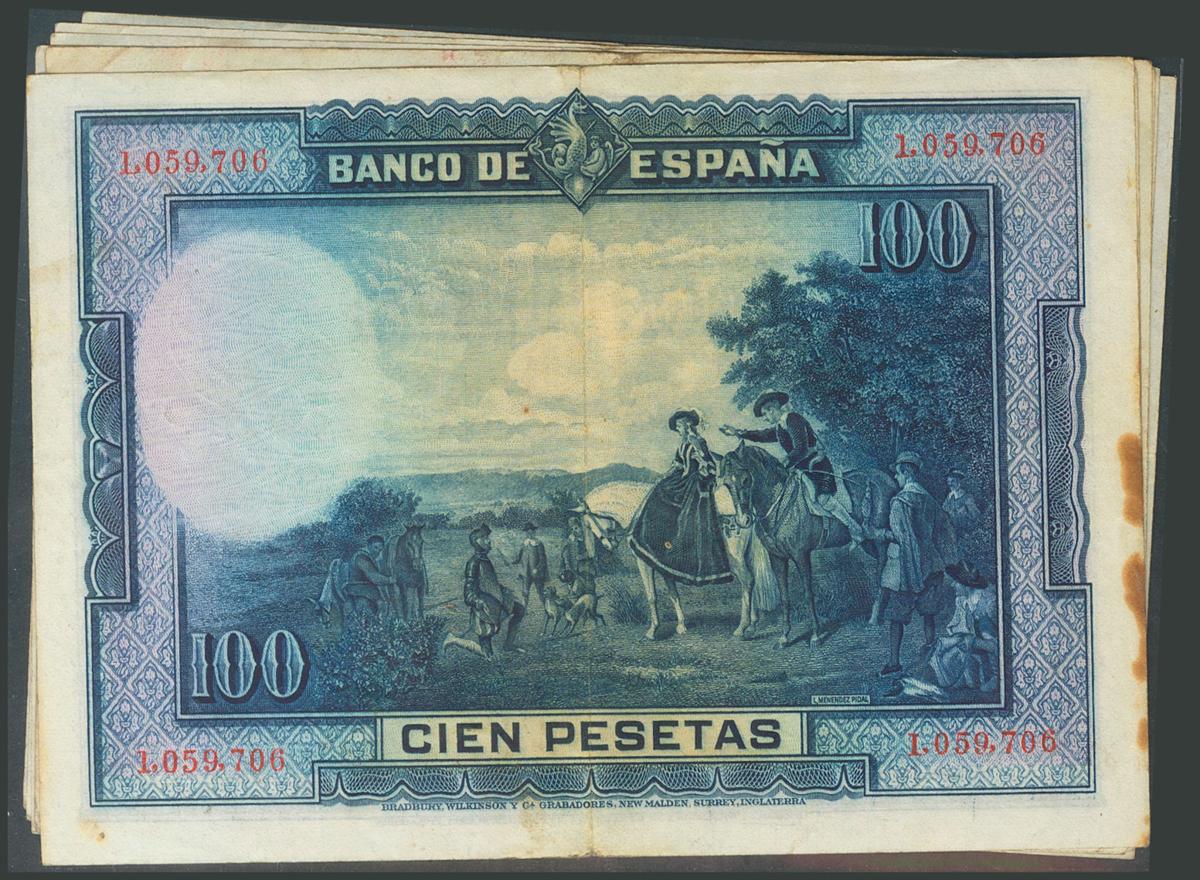 Conjunto de 7 billetes de 100 Pesetas emitidos el 15 de Agosto de 1928, sin serie. (Edifil 2017: 355). MBC/RC.