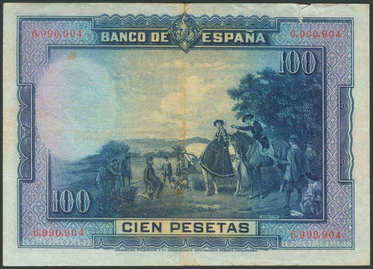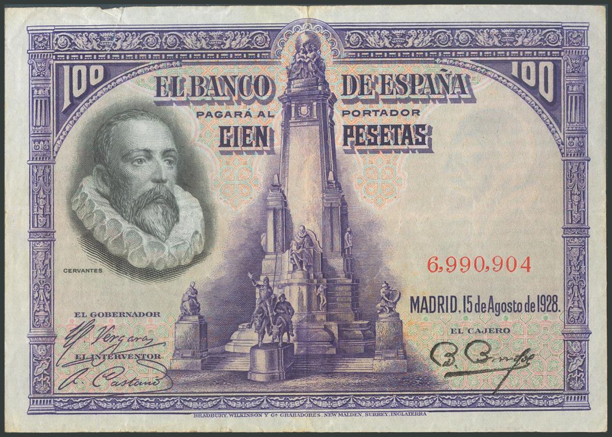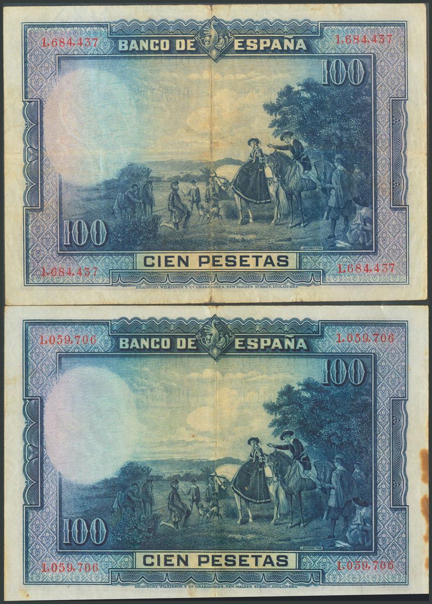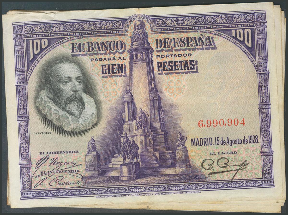 Conjunto de 7 billetes de 100 Pesetas emitidos el 15 de Agosto de 1928, sin serie. (Edifil 2017: 355). MBC/RC.