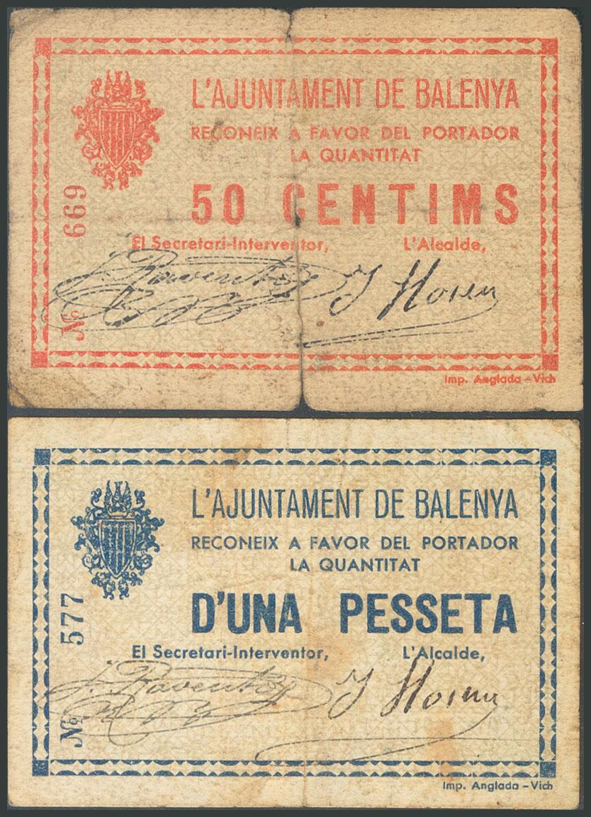 BALENYA (BARCELONA). 50 Céntimos y 1 Peseta. (1938ca). (González: 6993/94). Rara serie tipo completa. RC/BC.