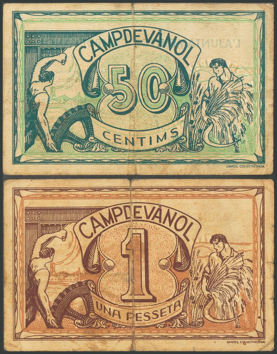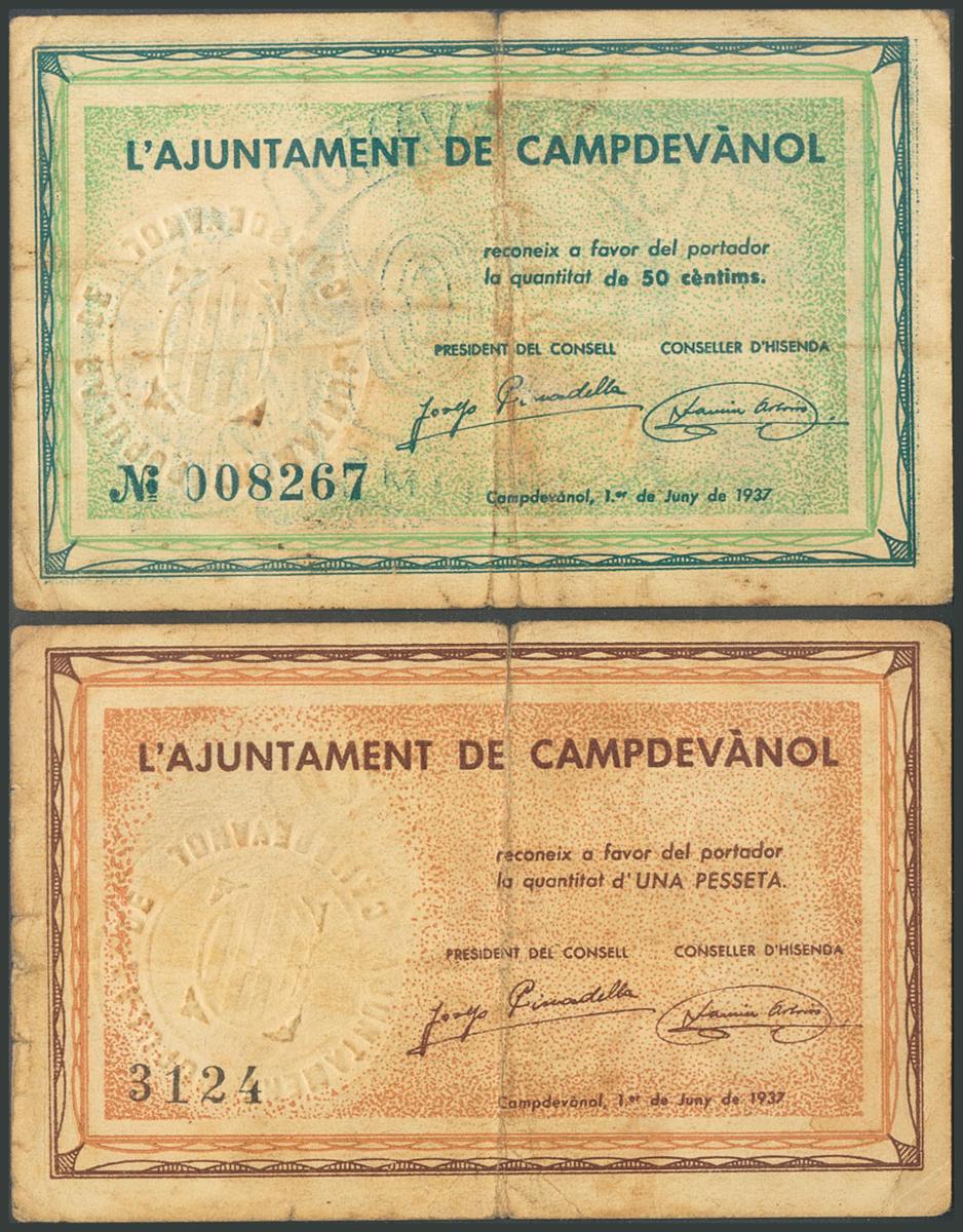 CAMPDEVANOL (GERONA). 50 Céntimos y 1 Peseta. 1 de Junio de 1937. (González: 7328/29). Inusual serie completa. BC.