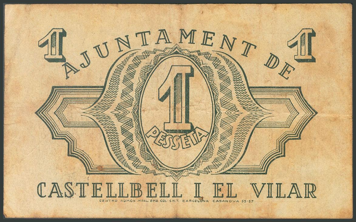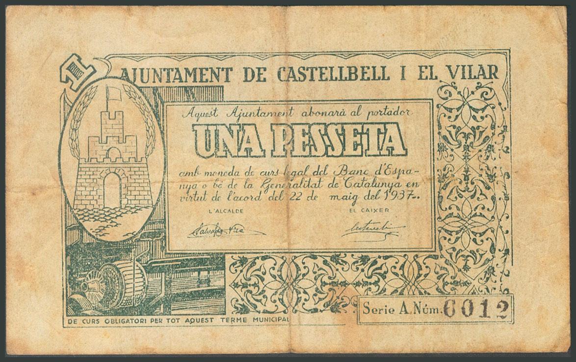 CASTELLBELL I EL VILAR (BARCELONA). 1 Peseta. 22 de Agosto de 1937. Serie A. (González: 7427). BC.