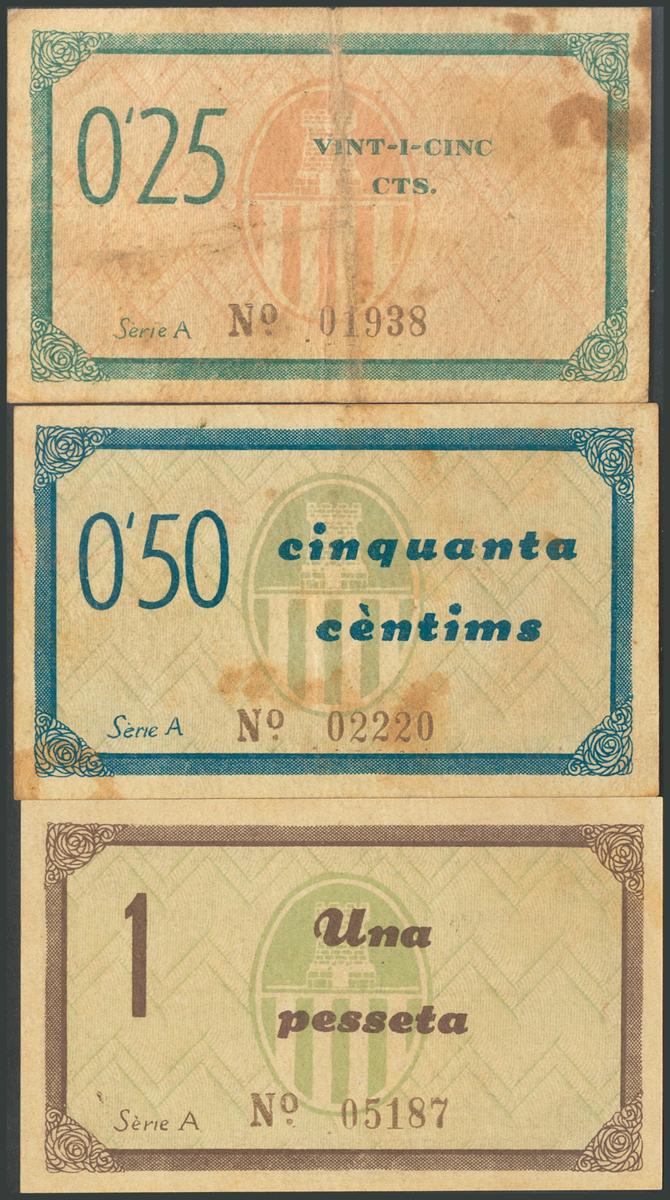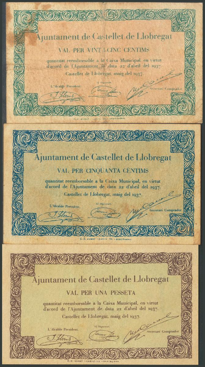 CASTELLET DE LLOBREGAT (BARCELONA). 25 Céntimos, 50 Céntimos y 1 Peseta. Mayo 1937. Serie A, los tres billetes. (González: 7449/51). BC/ SC-.