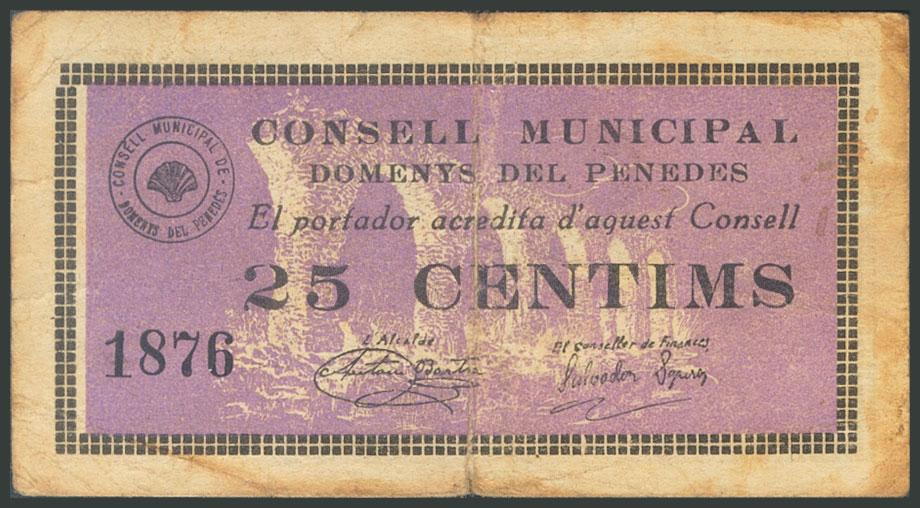DOMENYS DEL PENEDES (TARRAGONA). 25 Céntimos. Septiembre 1937. (González: 7715). BC+.