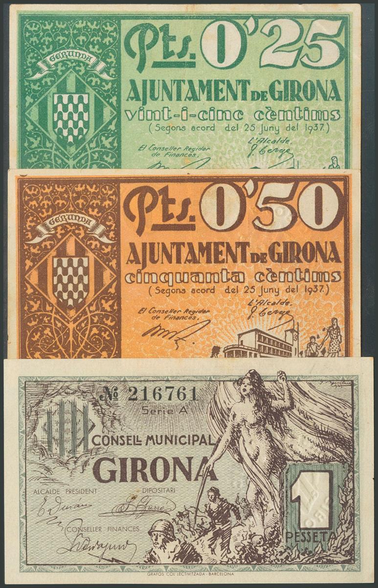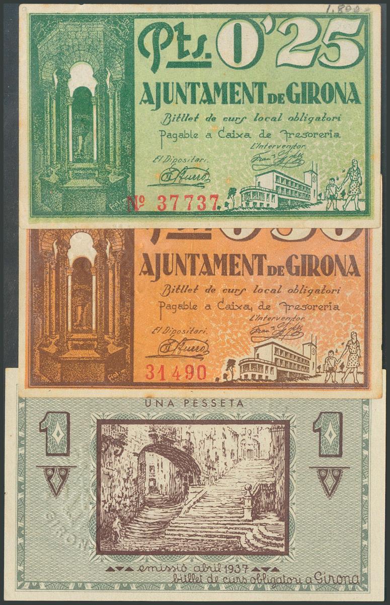 GERONA. 25 Céntimos, 50 Céntimos y 1 Peseta. Junio 1937 y Julio 1937. El 1 pts serie A. (González: 8031, 8032, 8030). MBC/EBC+.