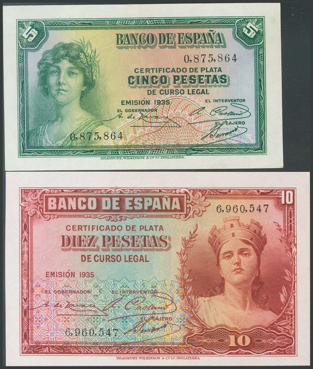 5 Pesetas y 10 Pesetas. 1935. Sin serie. (Edifil 2017: 363/64). SC.