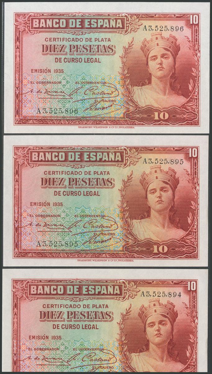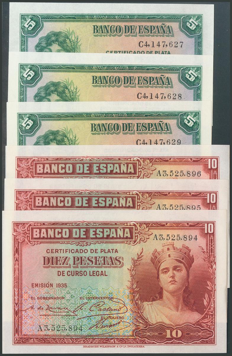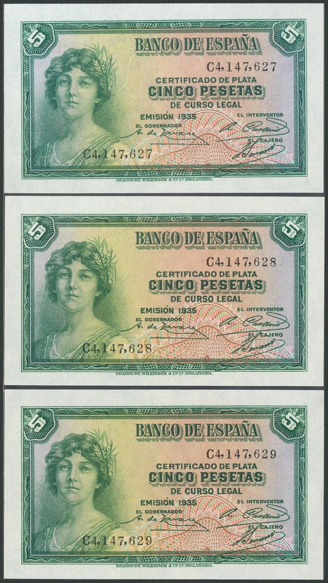 5 Pesetas y 10 Pesetas. 1935. Trío correlativo. Series C y A, respectivamente. (Edifil 2017: 363/64a). Apresto original. SC/SC-.