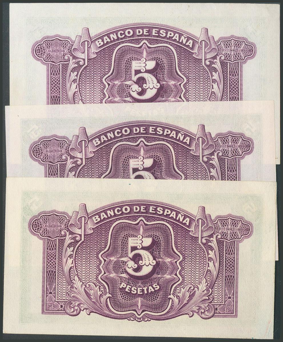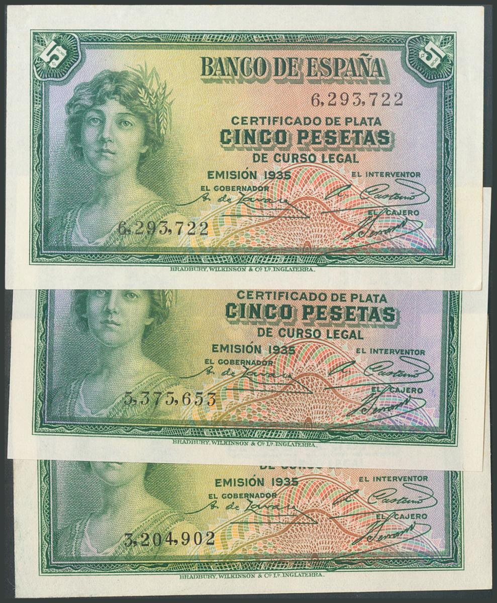 Conjunto de 3 billetes de 5 Pesetas emitidos en 1935, sin serie. (Edifil 2017: 363). SC/EBC.