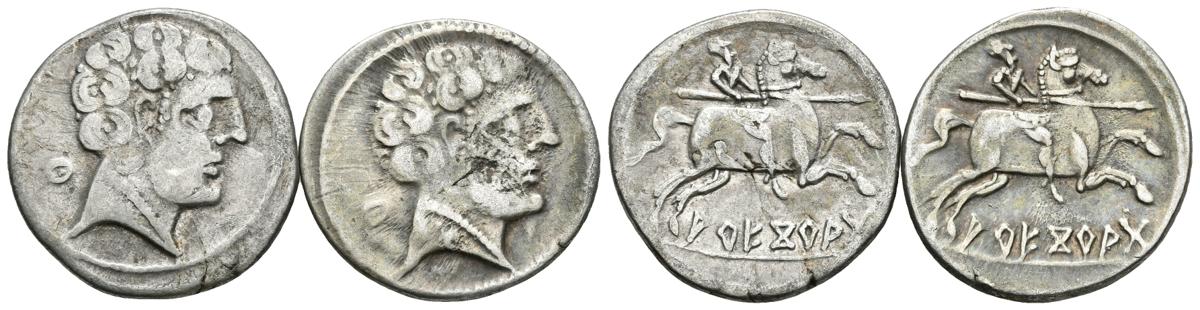 ARECORATAS. Denario. 150-20 a.C. Agreda (Soria). A/ Cabeza masculina a derecha con torque simple, detrás letra ibérica Cu. R/ Jinete con lanza a derecha, debajo ARECoRATa. FAB-111. Ar. 3,71 y 3,80g. BC+/MBC+. Muy escasas. * Esta pareja de denarios proceden inusualmente del mismo cuño tanto de anverso como reverso. Muy rara coincidencia.