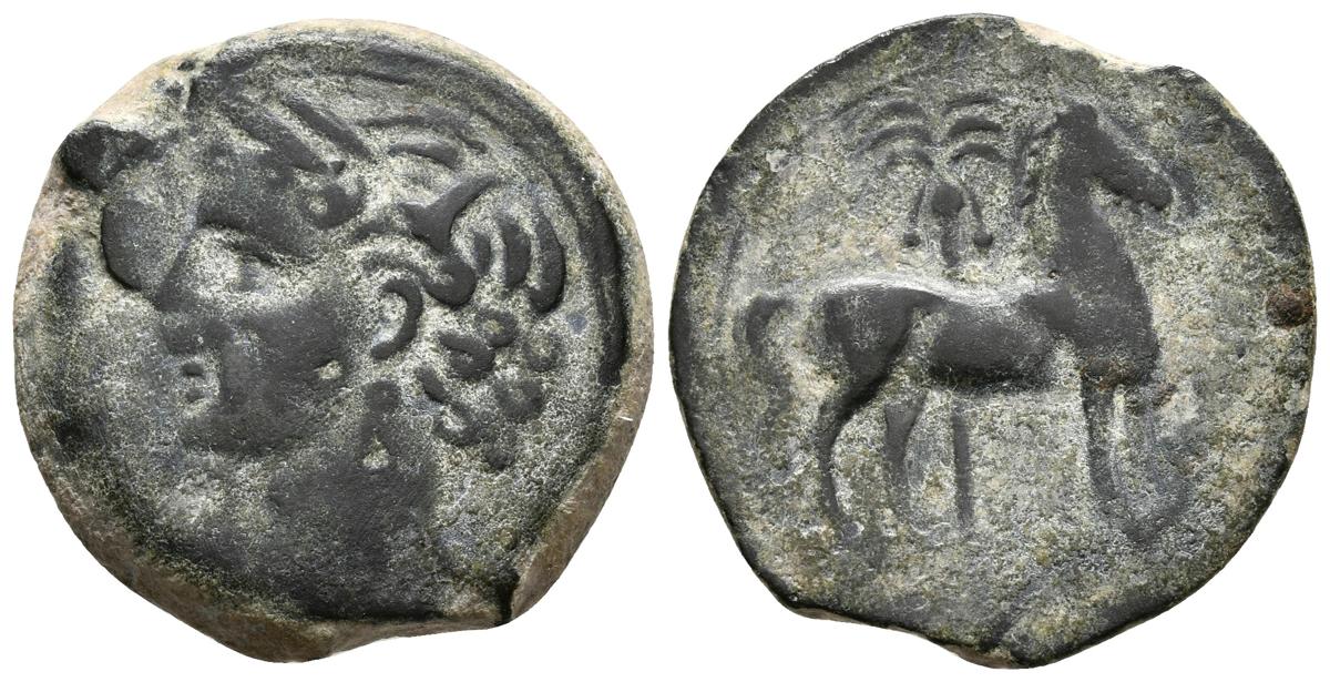 CARTAGONOVA. Calco. 220-215 a.C. Cartagena (Murcia). A/ Cabeza de Tanit a izquierda. R/ Caballo parado a derecha, detrás palmera con frutos. FAB-505. Ae. 8,58g. MBC.