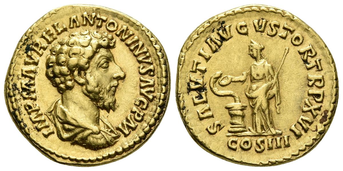 MARCO AURELIO. Aureo. 161-162 d.C. Roma. A/ Cabeza a derecha, drapeado y con coraza. IMP M ANTONINVS AVG PM. R/ Salus estante a izquierda sosteniendo cetro y pátera con la que alimenta a una serpiente que está enrollada alrededor del altar. SALVTI AVGVSTOR TR P XVI. RIC 56; MIR 18, 38-2.17; Calicó 1912. Au. 7,20g. MBC+.