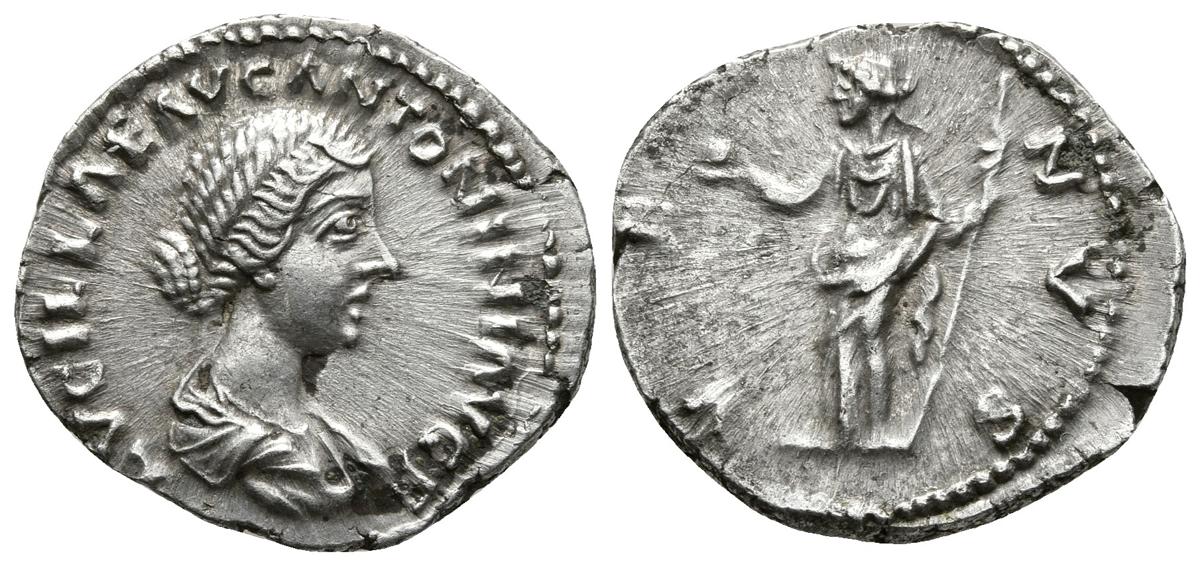 LUCILLA. Denario. 164-169 d.C. Roma. A/ Busto drapeado a derecha LVCILLAE AVG ANTONINI AVG F. R/ Venus estante a izquierda portando cetro y globo. VENVS. RIC 784. Ar. 3,13g. EBC-/MBC+.