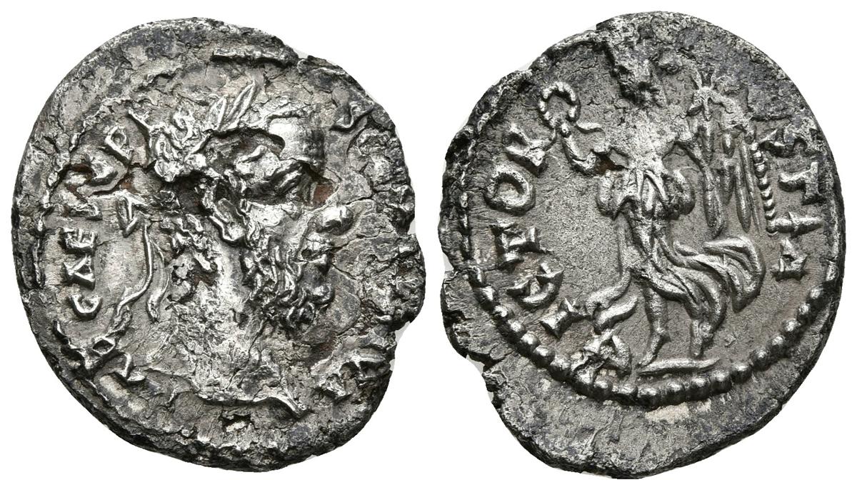 PESCENIO NIGER. Denario. 193-194 d.C. Antioquia. A/ Busto laureado a derecha. IMP CAES C PESCE NIGER IVST. R/ Victoria avanzando a izquierda portando palma y corona. VICTOR IVSTIA. BMC 81, 314; RIC 36, 81var; C. 78. Ar. 2,63g. MBC/MBC+. Rara.