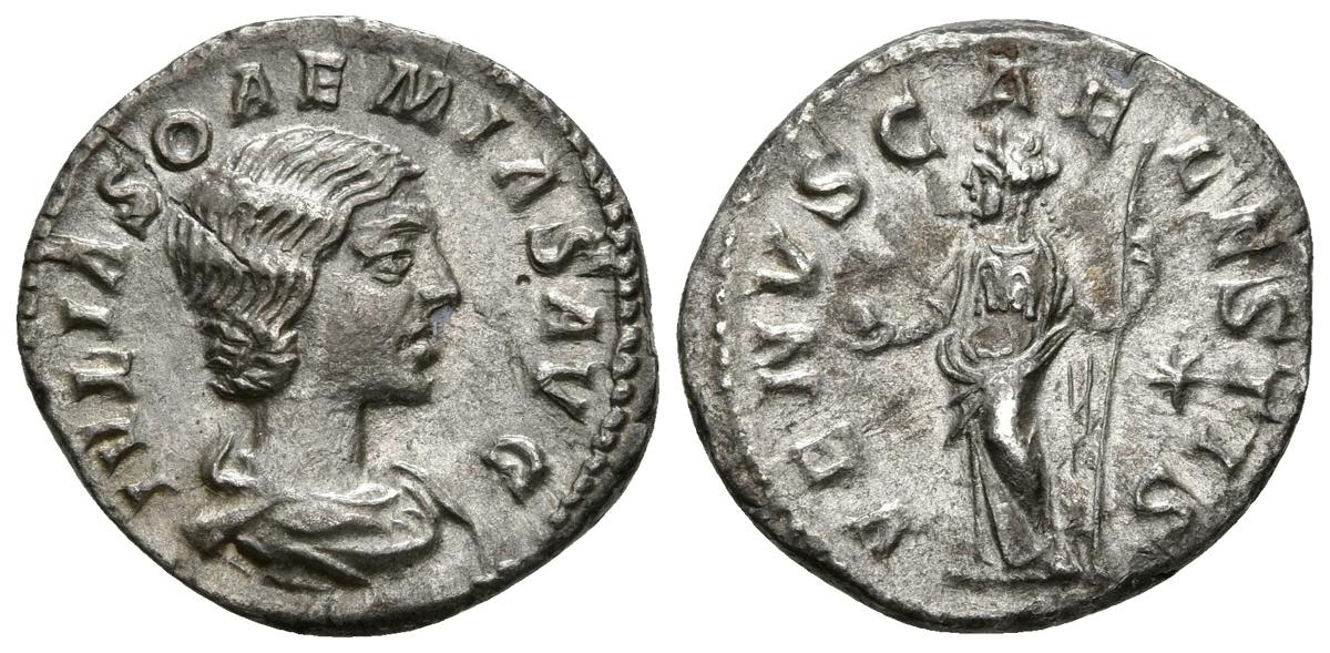 JULIA SOEMIAS. Denario. 218-222 d.C. Roma. A/ Busto drapeado a derecha. IVLIA SOEMIAS AVG. R/ Venus estante a izquierda con manzana y cetro, a su derecha estrella. VENVS CAELESTIS. RIC 241. Ar. 2,94g. Raya en anv. MBC+.