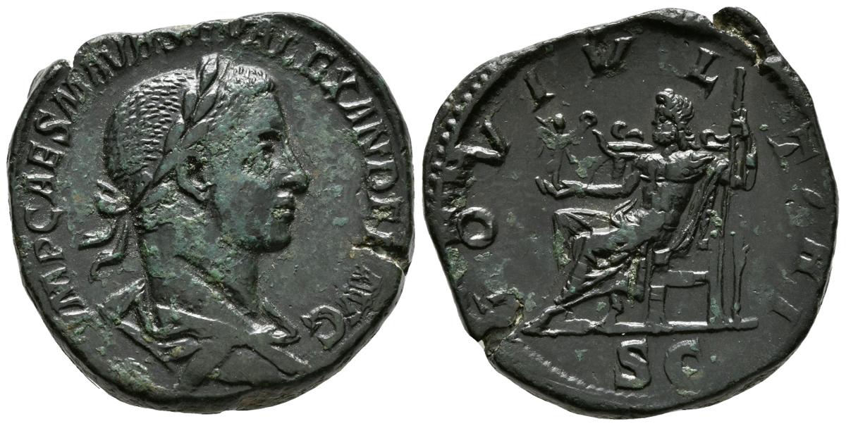 ALEJANDRO SEVERO. Sestercio. 222-231 d.C. Roma. A/ Busto laureado y drapeado con coraza a derecha. IMP CAES M AVR SEV ALEXANDER AVG. R/ Júpiter sedente a izquierda portando cetro y Victoria. IOVI VLTORI, en exergo S C. RIC 560; C 98. Ae. 22,18g. Magnífico ejemplar. EBC.