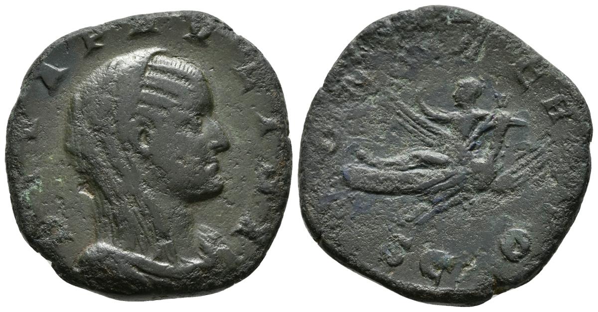 PAULINA. Sestercio. 236 d.C. Roma. A/ Busto velado y drapeado a derecha. DIVA PAVLINA. R/ Paulina volando a derecha sobre pavo real. CONSECRATIO, en exergo S C. RIC 3; BMCRE 132 (Maximinus); Banti 1. Ae. 15,44g. MBC-/BC+. Escasa.