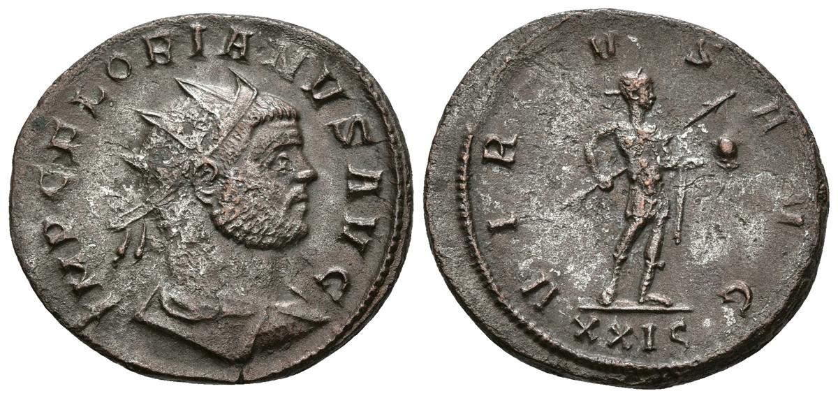 FLORIANO. Antoniniano. 276 d.C. Roma. A/ Busto radiado y drapeado con coraza a derecha. IMP C FLORIANVS AVG. R/ Emperador estante a derecha portando lanza y globo. VIRTVS AVG, en exergo XXI S. RIC 47. Ve. 4,52g. MBC.
