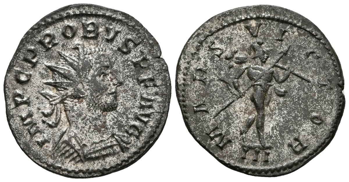 PROBO. Antoniniano. 277 d.C. Lugdunum. A/ Busto radiado con coraza a derecha. IMP C PROBVS P F AVG. R/ Marte en marcha a derecha portando trofeo y lanza, en exergo III. MARS VICTOR. RIC 38; Bastien 194. Ve. 3,14g. Conserva el plateado original. EBC-.