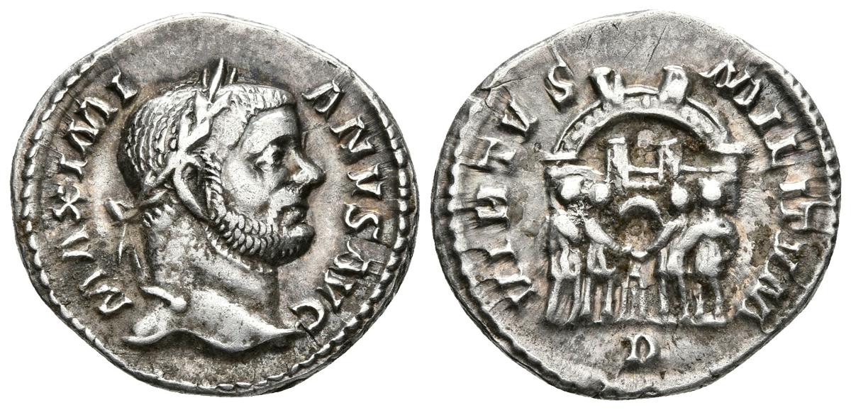MAXIMIANO. Argenteo. 295-297 d.C. Treveri (Trier). A/ Busto laureado a derecha. MAXIMIANVS AVG. R/ Cuatro tetrarcas realizando sacrificio sobre trípode delante de la puerta de un campamento con seis torretas. VIRTVS MILITVM, en exergo D. RIC VI 109b. Ar. 3,14g. EBC-.