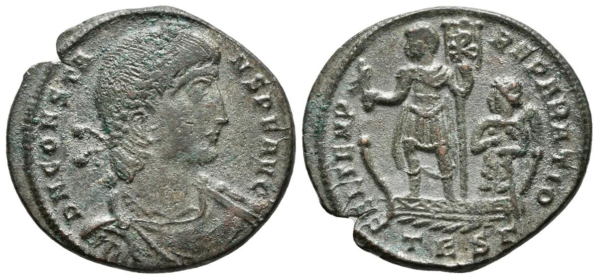 CONSTANTE. Maiorina. 337-350 d.C. Thessalónica. A/ Busto con diadema de perlas, drapeado y con coraza a derecha. D N CONSTANS P F AVG. R/ Emperador estante a izquierda sobre la proa de una galera con fénix y estandarte con Labarum (crismón), en la popa victoria a los mandos del timón. FEL TEMP REPARATIO, en exergo TESr. RIC 109. Ae. 4,87g. MBC/EBC-.