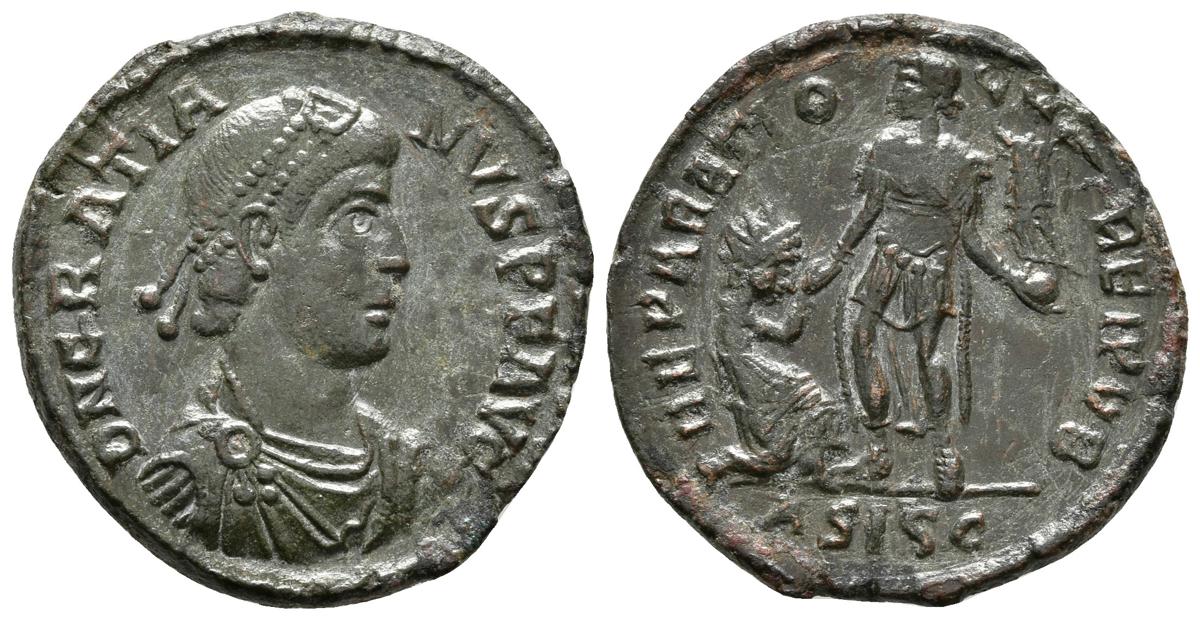 GRACIANO. Maiorina. 379-383 d.C. Siscia. A/ Busto diademado y drapeado con coraza a derecha. D N GRATIANVS P F AVG. R/ Emperador estante a izquierda sosteniendo Victoria sobre globo, a sus pies arrodillada mujer con corona mural. REPARATIO REIPVB, en exergo ASISC. RIC 26a; LRBC 1525. Ae. 4,69g. MBC+.
