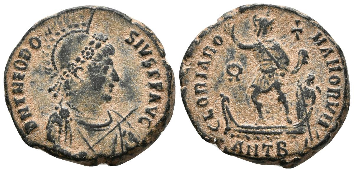 THEODOSIO I. Maiorina. 379 d.C. Antioquía. A/ Busto con casco, drapeado y con coraza a derecha, sosteniendo lanza y escudo. D N THEODOSIVS P F AVG. R/ Emperador en pie mirando a derecha sobre barco, levantando su mano derecha y Victoria manejando el timón, en el campo corona y en la parte superior cruz. GLORIA ROMANORVM, en exergo ANTB. RIC 40e. Ae. 6,91g. MBC+.