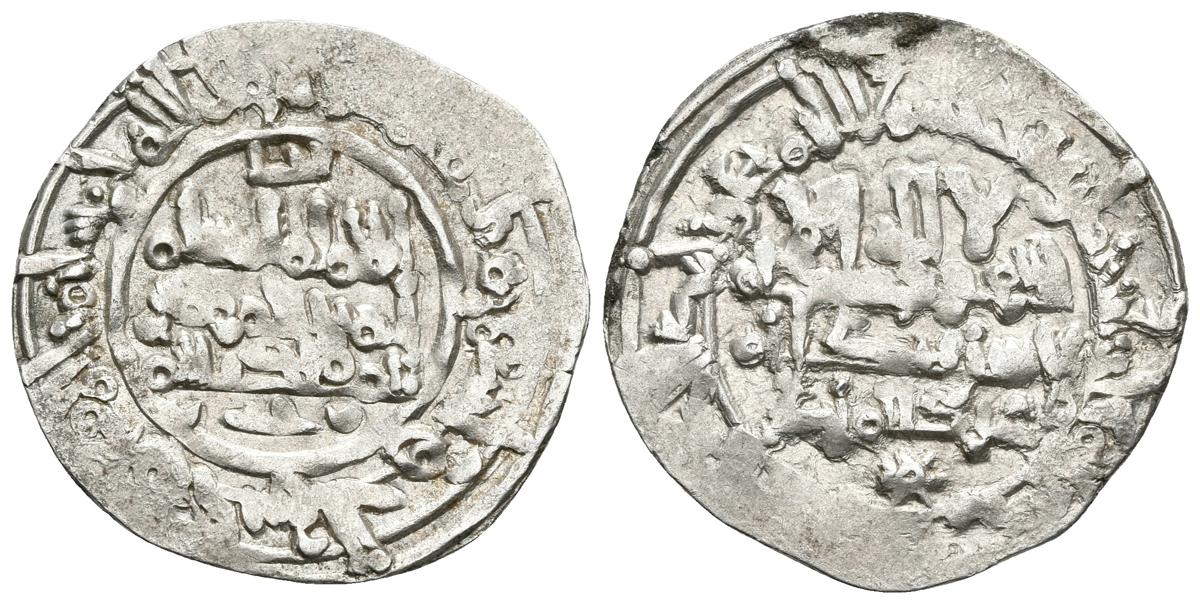 CALIFATO DE CORDOBA. Hisham II. Dirham. 394H. Madinat Fas (Fez). Citando a Al-Hayib y `Abd Al-Malik. V. 634/635. Ar. 2,87g. Distribución similar al 395H que vives no cita en este año. MBC+. Rara.