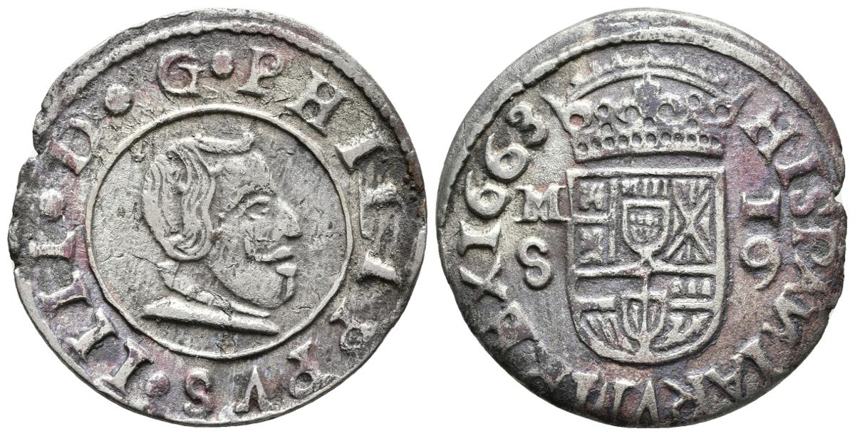FELIPE IV. 16 Maravedís. 1663. Madrid S. Cal-1399; J.S. M-375. Ae. 4,35g. Conserva gran parte del plateado original. MBC+.