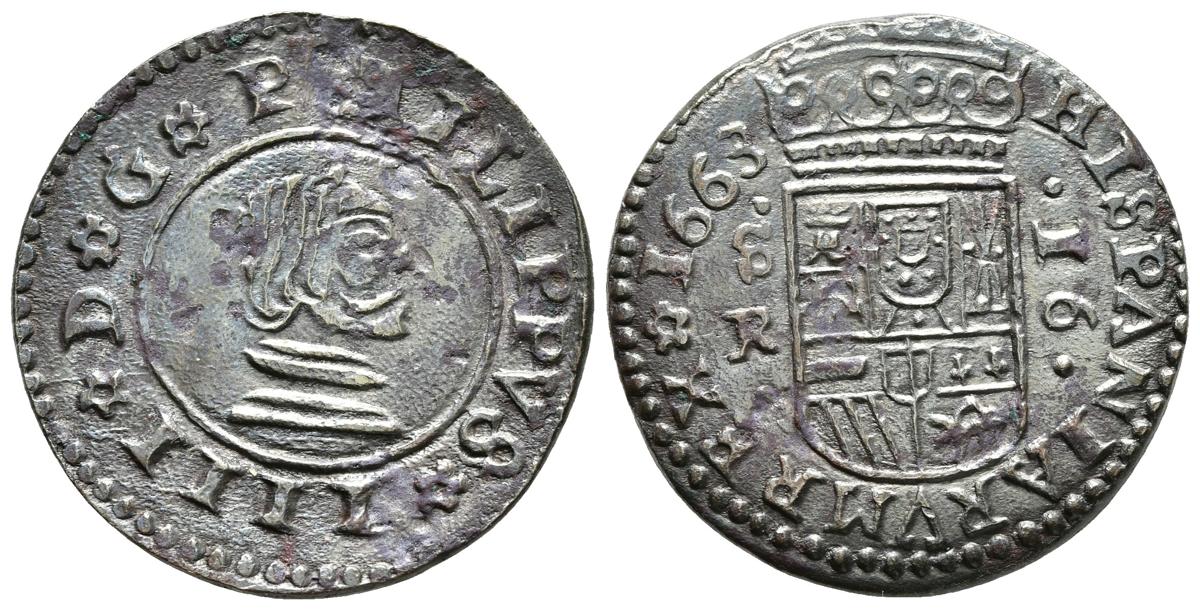 FELIPE IV. 16 Maravedís. 1663. Sevilla R. Falsa de época. J.S. pág. 470. Ae. 4,77g. EBC/EBC+. Magnífico ejemplar para este tipo.
