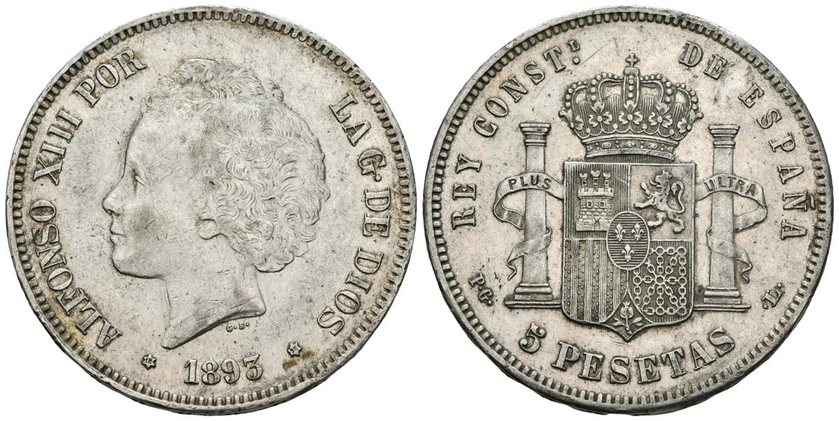 ALFONSO XIII. 5 Pesetas. 1893 *18-93. Madrid PGL. Tipo "Bucles". Cal-21. Ar. 24,95g. EBC-.