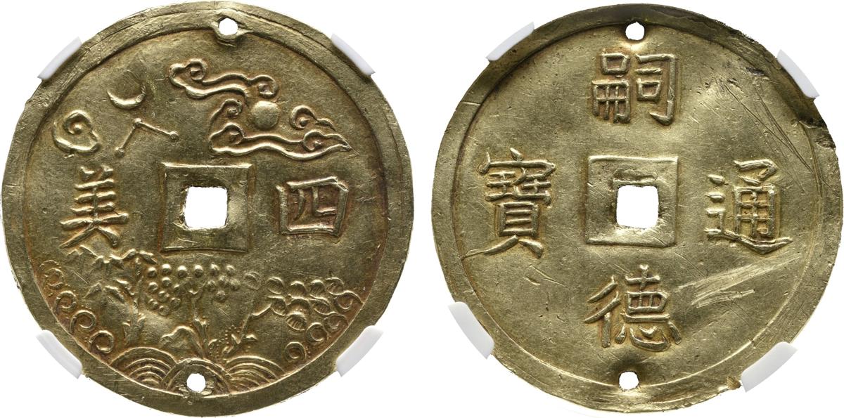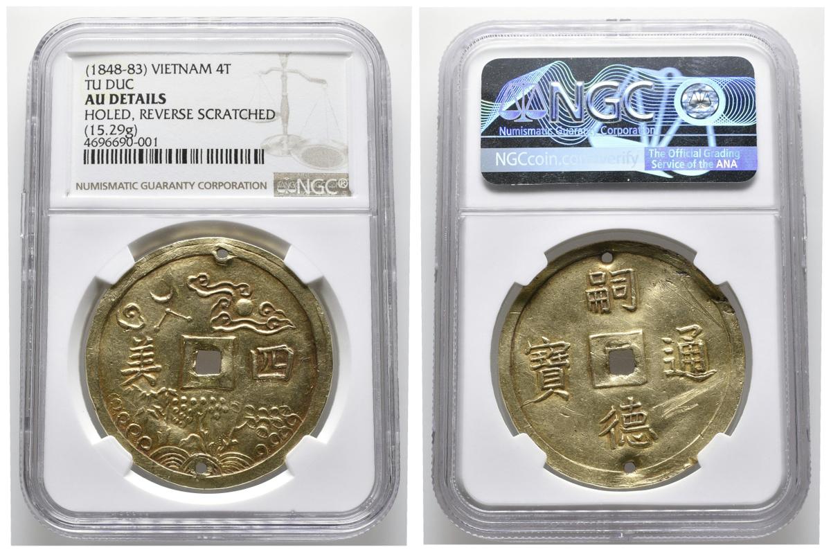 VIETNAM. Tu Duc. 4 Tien. 1843-1883. Annam. A/ "TU DUC THOUG BAO" alrededor de la perforación central. R/ "TU MY" alrededor de la perforación central. Certificado por NGC 4696690-001. Km#533; Sch-409.1. Au. Dos perforaciones habituales en estas piezas para ser usadas como decoración orifical y rayas en reverso. MBC+. Rara.