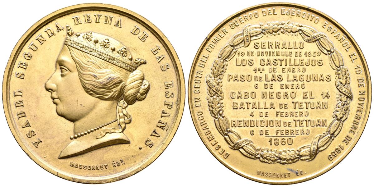 ISABEL II. Batallas de la Guerra de Marruecos. 1860. R/ DESEMBARCO EN CEUTA DEL PRIMER CUERPO DEL EJERCITO ESPAÑOL EL 19 DE NOVIEMBRE DE 1859. Por dentro de la leyenda anterior, guirnalda circular que encierra la siguiente leyenda SERRALLO-19 DE NOVIEMBRE DE 1859-LOS CASTILLEJOS-1ER DE ENERO-PASO DE LAS LAGUNAS-6 DE ENERO-CABO NEGRO EL 14-BATALLA DE TETUAN-4 DE FEBRERO-RENDICION DE TETUAN-6 DE FEBRERO DE 1860. Grabador: Massonnet. V.Q. 14345. Plata dorada. 53,87g. 50mm. Golpecito en el canto. SC. Rara.