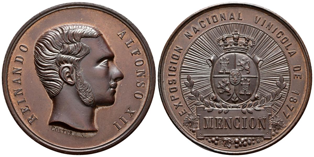 ALFONSO XII. Exposición Nacional Vinícola. 1877. Mención. Grabador: Cortés. V-473. Br. 36,30g. 41mm. Presentada en estuche original (Deteriorado). SC.