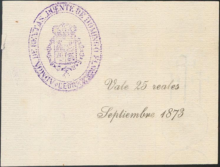 25 Reales. Septiembre 1873. Vale de la Administración de Rentas de Puente de Domingo Flórez (León). (Edifil 2017: página 26). Muy Raro. EBC.