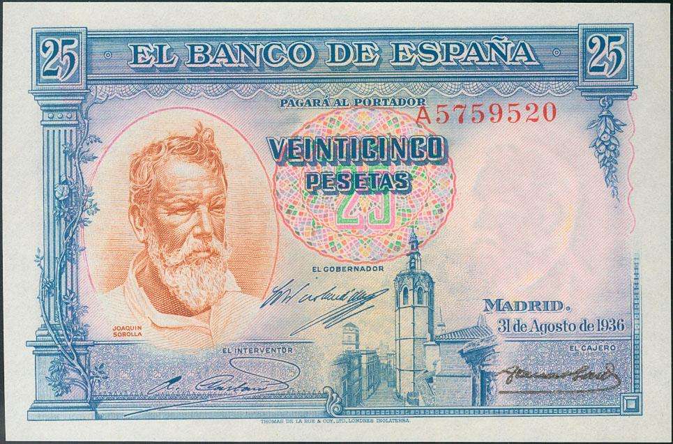 25 Pesetas. 31 de Agosto de 1936. Serie A. (Edifil 2017: 367a). Apresto original. SC.