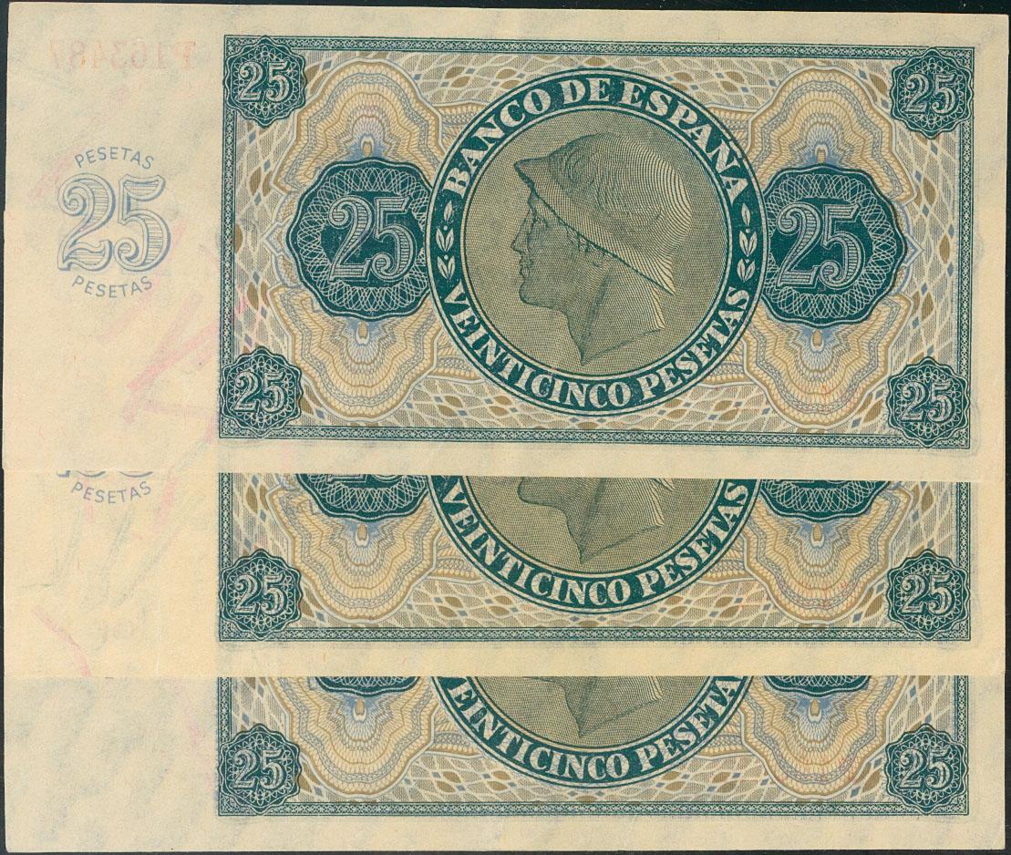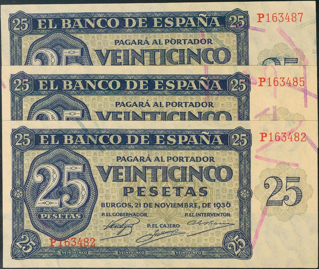 25 Pesetas. 21 de Noviembre de 1936. Banco de España, Burgos, trío casi consecutivo. Serie P. Ondulados verticalmente, fibra sin romper. Apresto original. (Edifil 2017: 419a). EBC+.