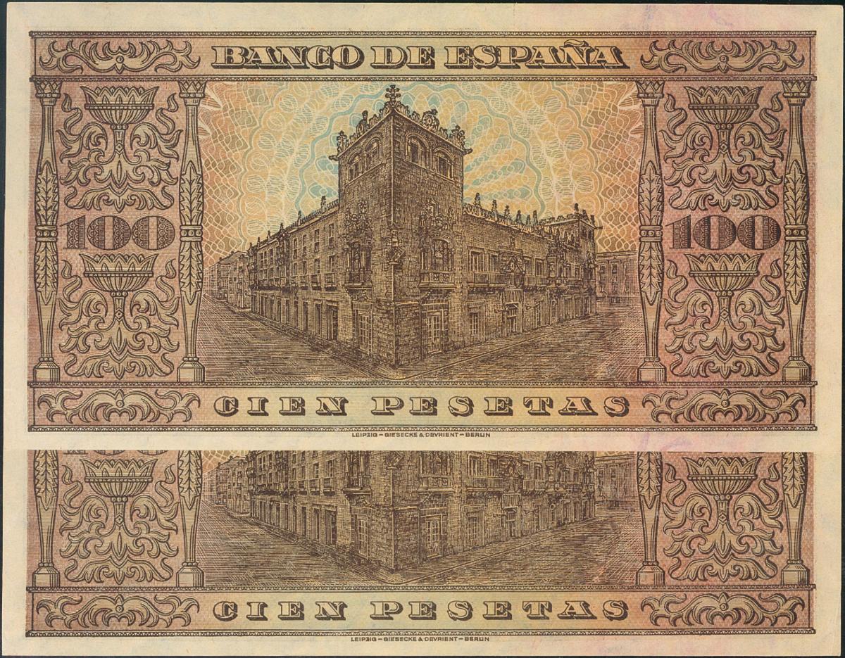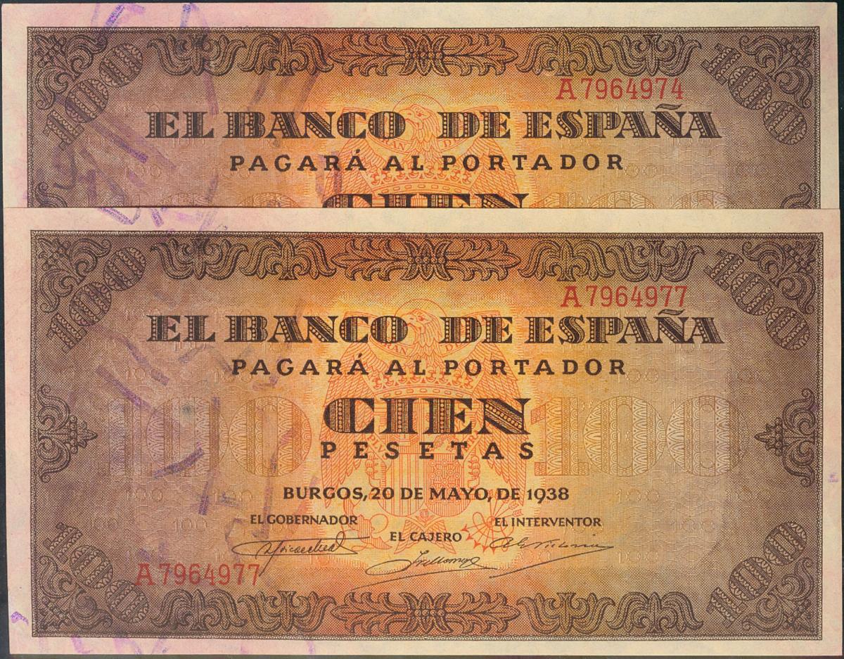 100 Pesetas. 20 de Mayo de 1938. Banco de España, Burgos, pareja casi correlativa. Serie A. Apresto original. (Edifil 2017: 432). EBC+.