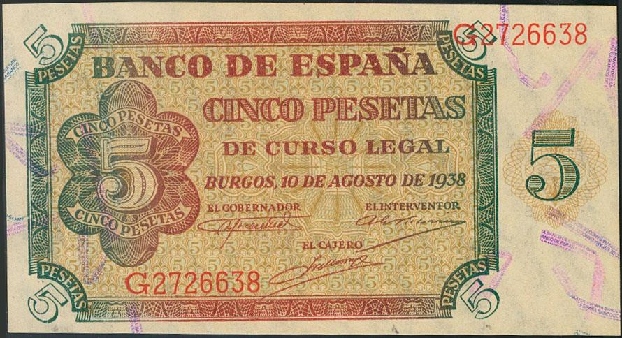 5 Pesetas. 10 de Agosto de 1937. Serie G. (Edifil 2017: 435a). Apresto original. Inusual. SC.